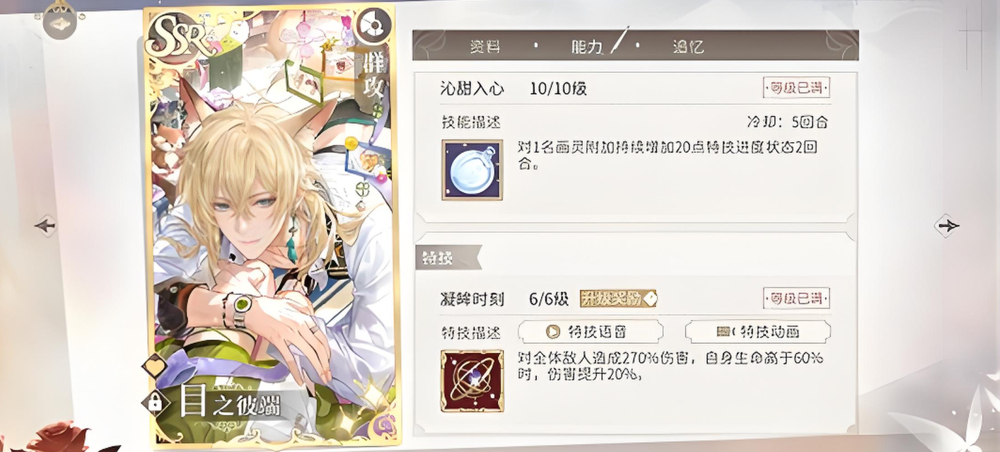 3、二技能能為單名畫靈附加特技進度提升狀態,冷卻五回合,特技有不錯倍率但無附加效果。