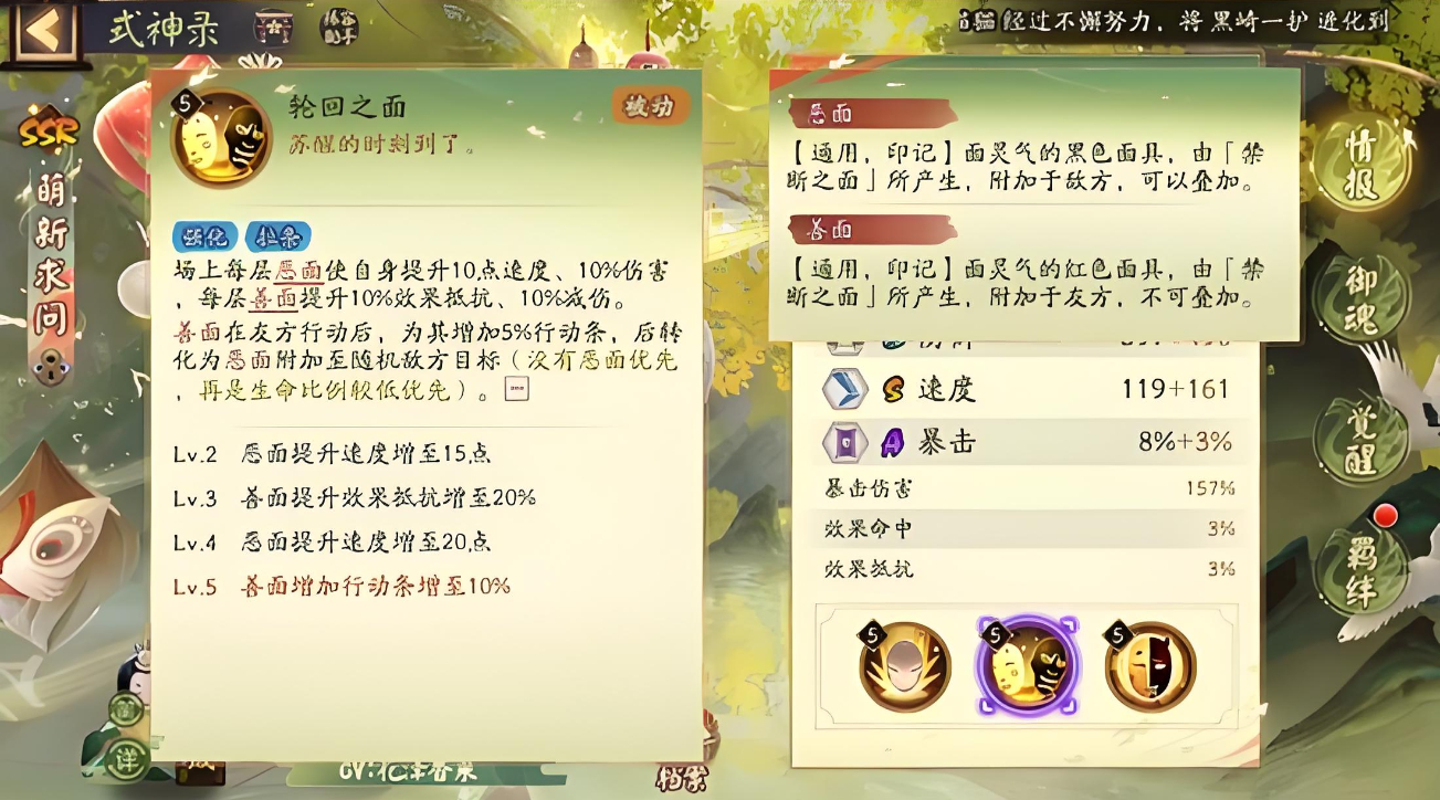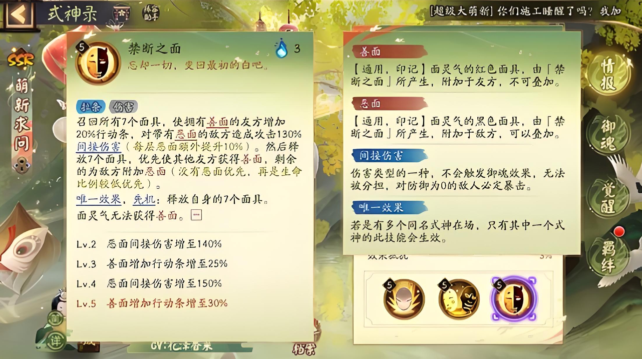 2、三技能需消耗三火召回面具,善面友方增加三十行動條,惡面敵方會承受其攻擊百分之一百三間接傷害。