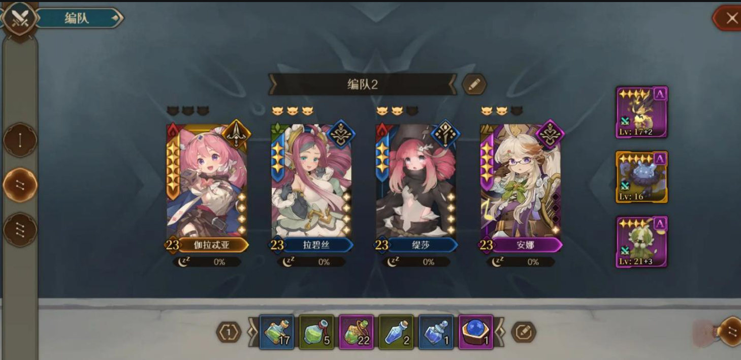 2、水隊以雪貂近衛為主輸出,搭配主角拉碧絲貝爾卡,兼具高頻輸出持續護盾與團隊增益,適合多類副本挑戰。