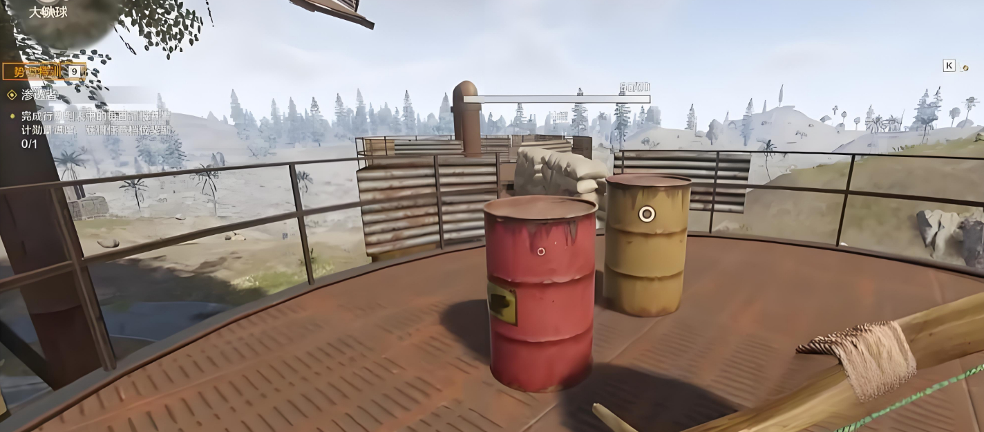 1、球體左右兩側有大型工業儲罐,罐旁配有螺旋式金屬樓梯,攀爬至罐頂射擊紅色警示標識的桶狀容器,可掉落劣質原油,需仔細搜尋避免遺漏。