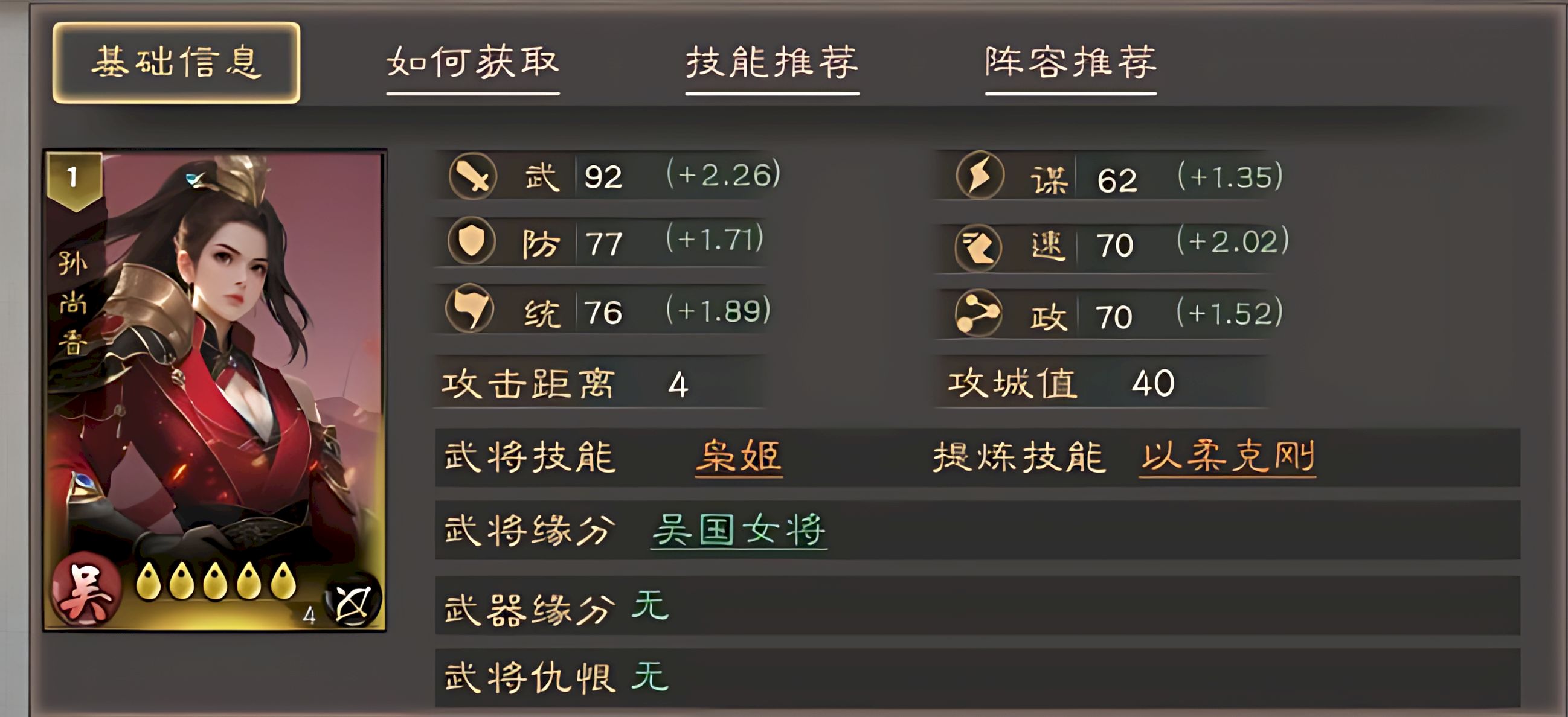 2、基礎屬性均衡且成長可觀,武92防77謀62統76,各項屬性增長合理,為輸出與生存提供堅實基礎。