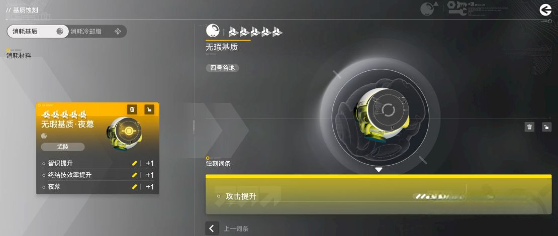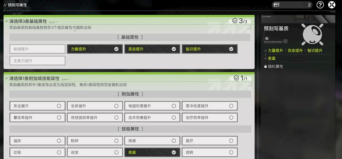 2、使用流程有固定步驟,通過預刻寫基質頁面操作,先選三條基礎屬性再選一條附加或技能屬性,可刷新優化。