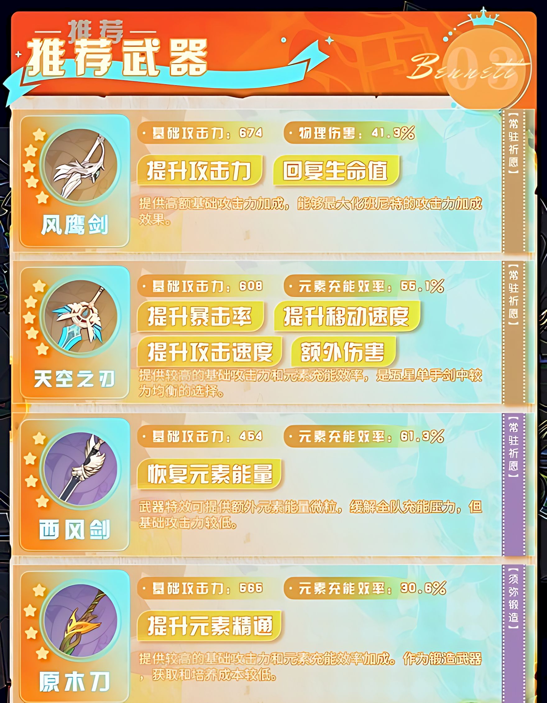 3、武器推薦風鷹劍天空之刃原木刀及西風劍,分別主打高額基礎攻擊均衡屬性充能效率和緩解全隊充能壓力。