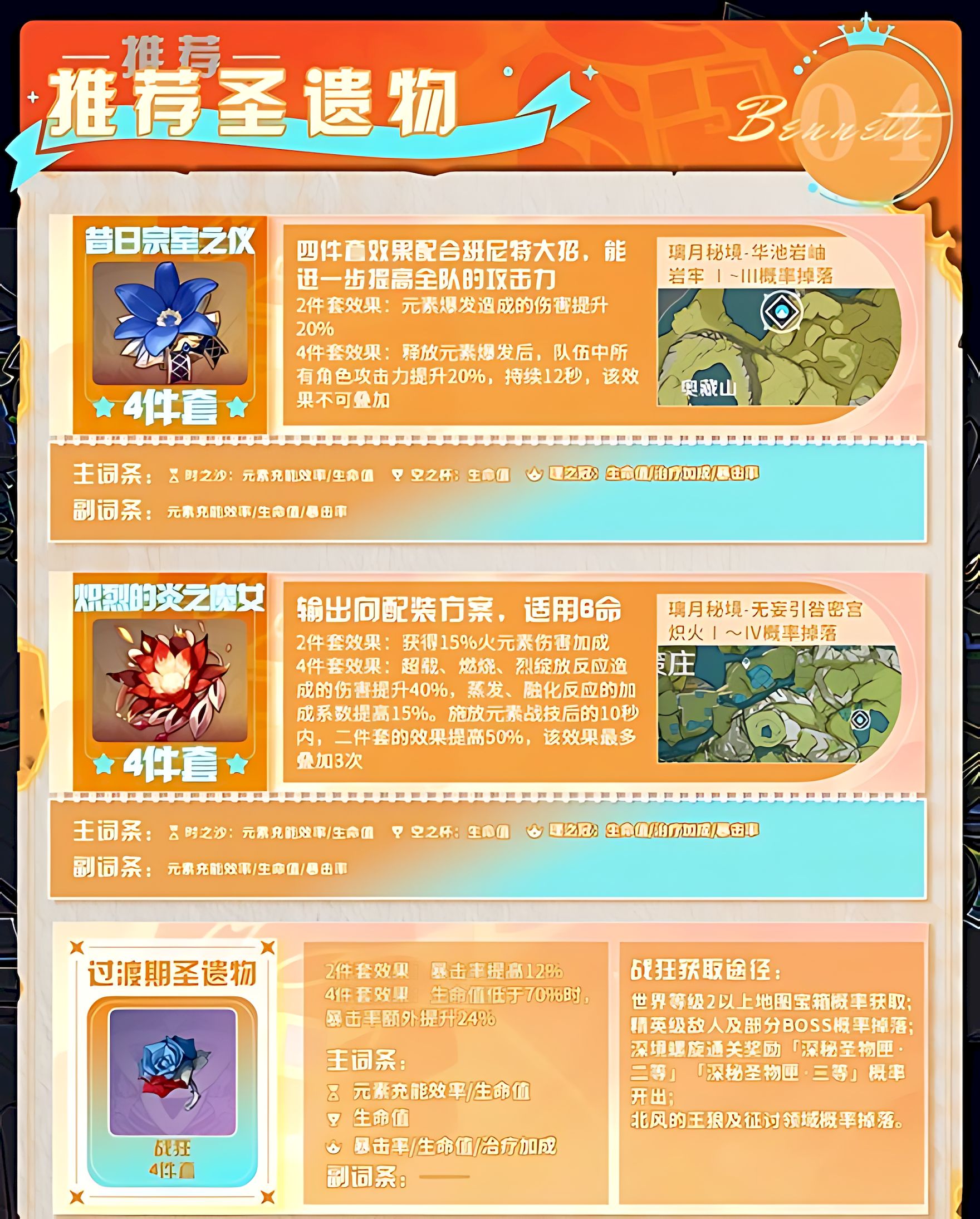 4、圣遺物首選昔日宗室之儀四件套,六命可選熾烈的炎之魔女四件套,過渡期用戰狂四件套,主詞條側重充能與生命值。