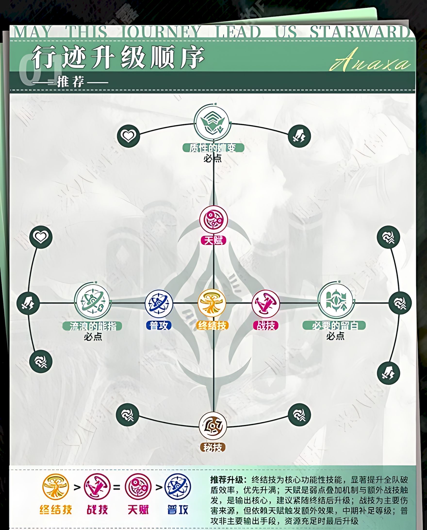 1、行跡升級優先升滿終結技提升全隊破盾效率,接著升級天賦保障輸出核心,中期補足戰技等級,資源充裕后再提升普攻等級。