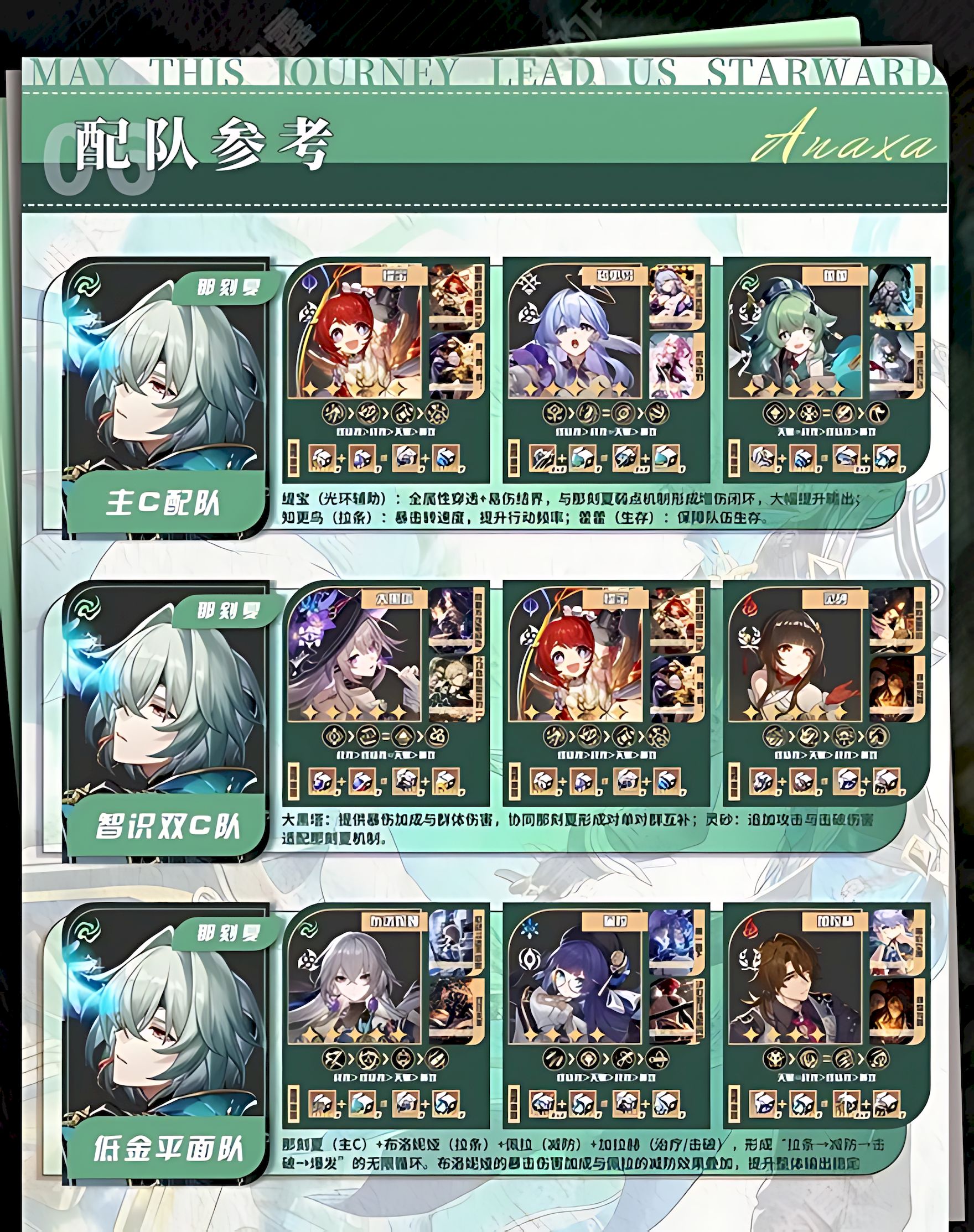 5、配隊有主C智識雙C低金平面等方案,搭配輔助拉條治療角色,形成增傷或生存輸出循環,適配各類戰斗場景需求。