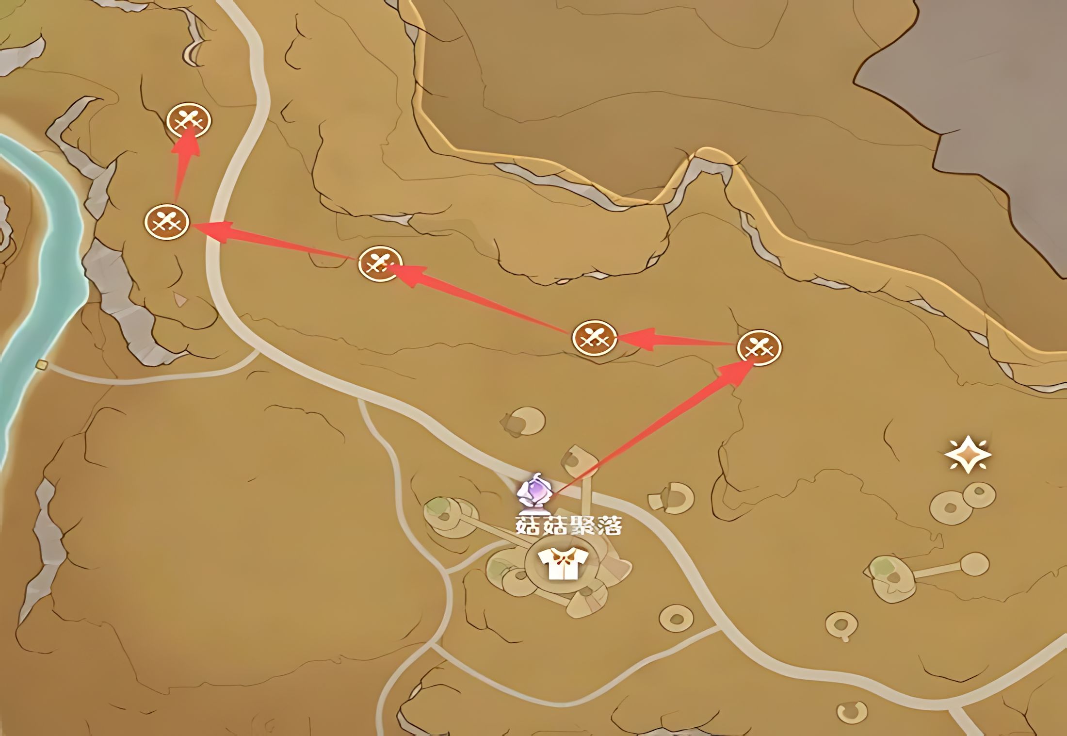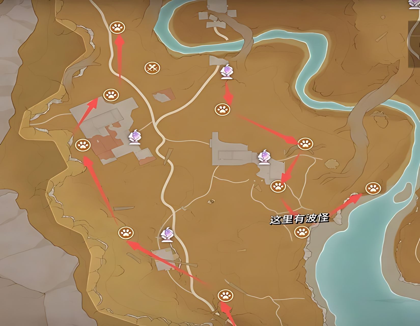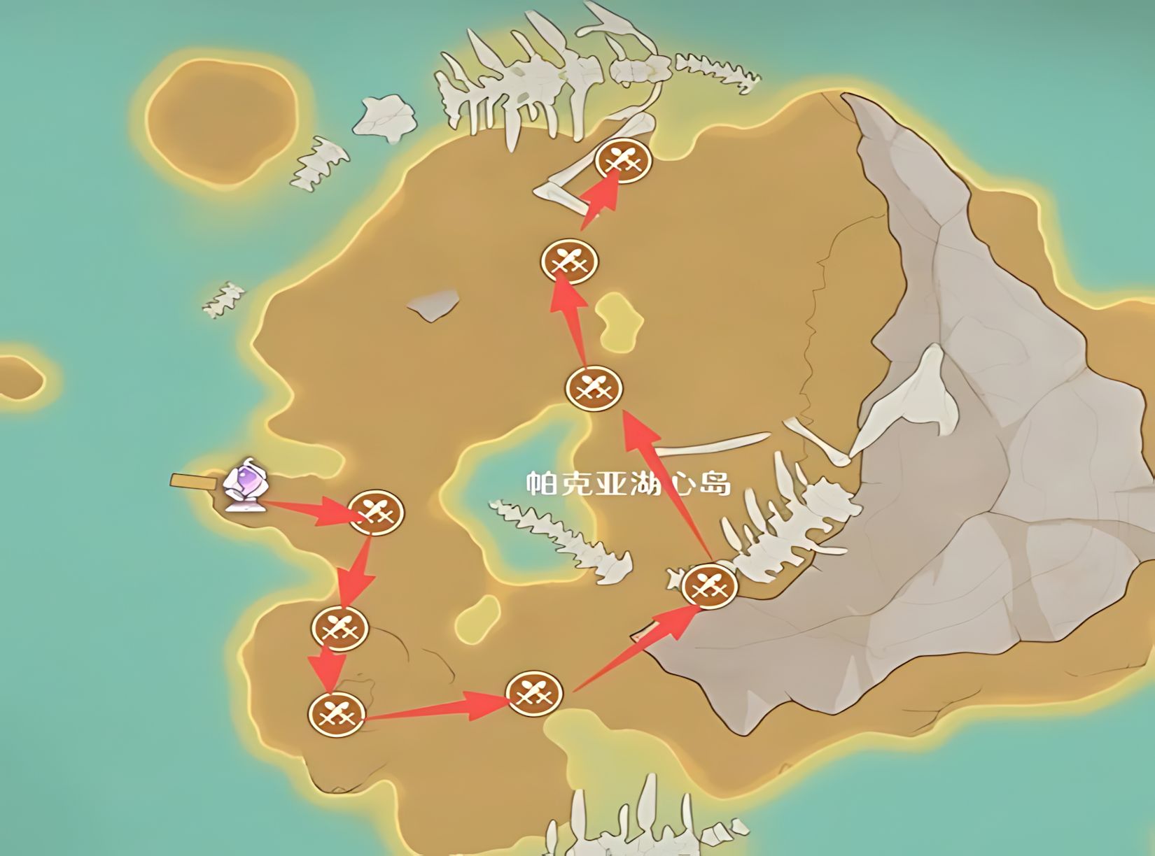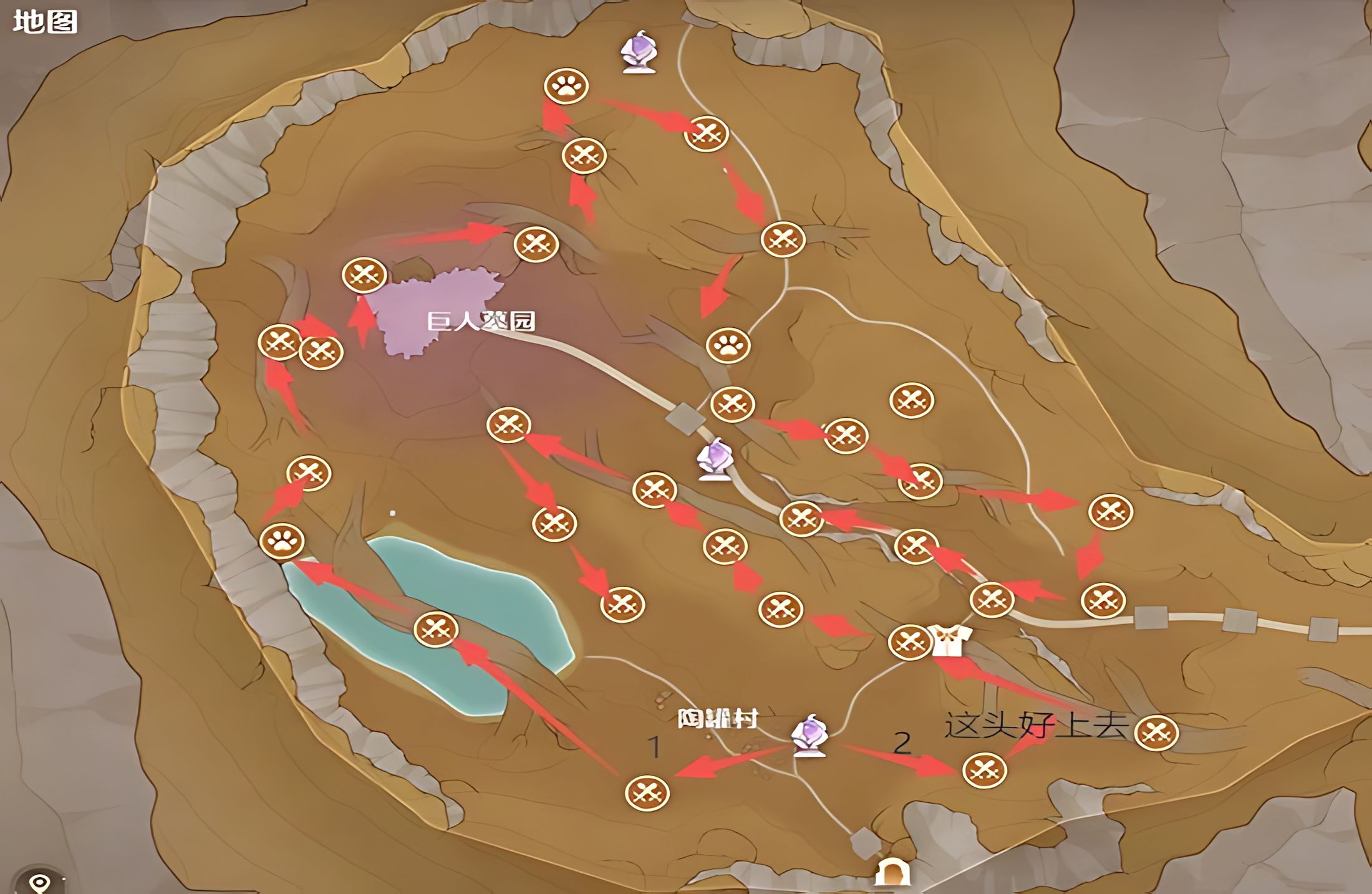 2、陶罐村標注適宜攀爬是輔助刷點,菇菇聚落和帕克亞湖心島2至4路線打滿需9分半,與墓園搭配能提升整體獲取效率。