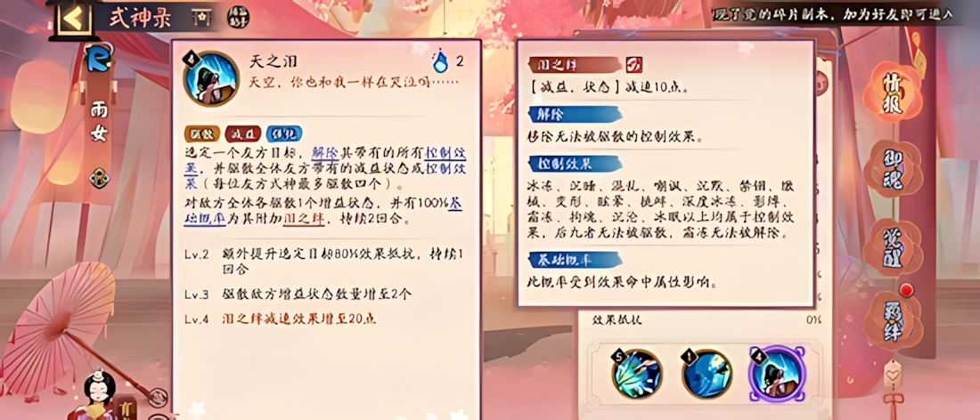 4、三技能對敵方全體驅散增益,初始數量為1個,等級提升后增至2個,有概率附加淚之絆減速效果。