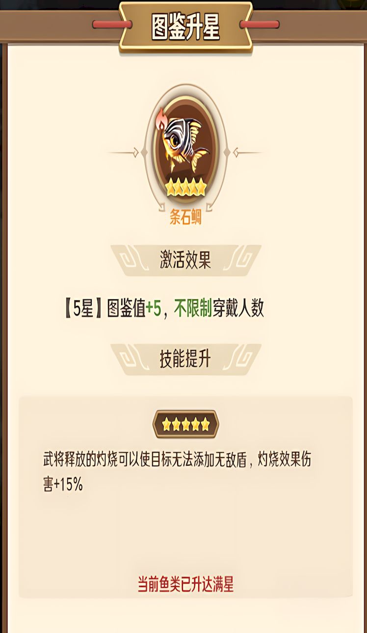 4、條石鯛為進階核心配裝,提升灼燒傷害倍率且阻止敵方開啟無敵護盾,針對性反制防御型陣容戰略價值突出。