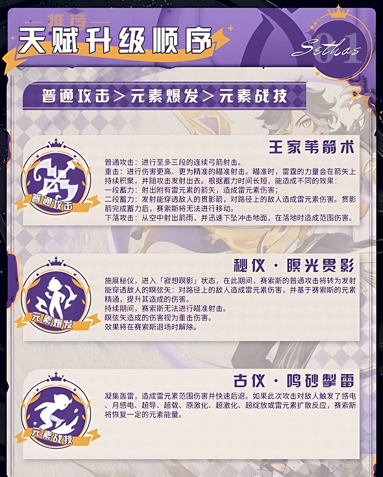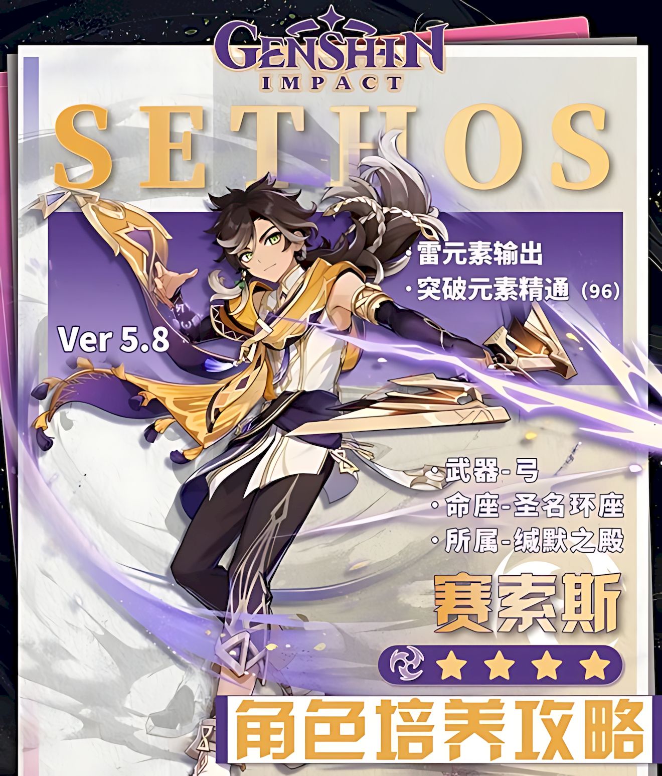 原神中雷元素弓系角色賽索斯,所屬緘默之殿命座為圣名環座,定位輸出且突破加成元素精通,培養需兼顧天賦、武器、圣遺物與配隊搭配。不少玩家在養成過程中面臨方向困惑,本文整合該角色核心培養要點,涵蓋天賦升級順序、專屬裝備選擇、實用隊伍組合及各類材料需求,助力高效提升戰力。