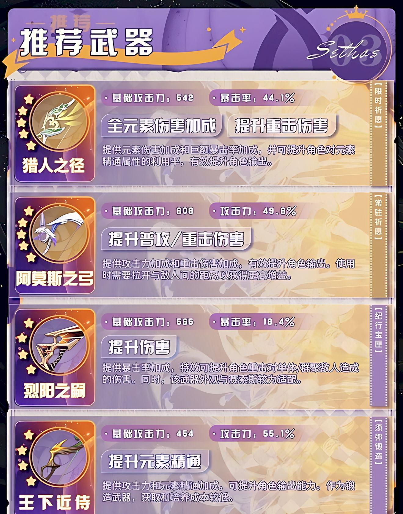 2、武器推薦獵人之徑阿莫斯之弓烈陽之嗣王下近侍,分別提供暴擊率元素傷害加成等屬性,適配不同培養成本與戰斗場景。