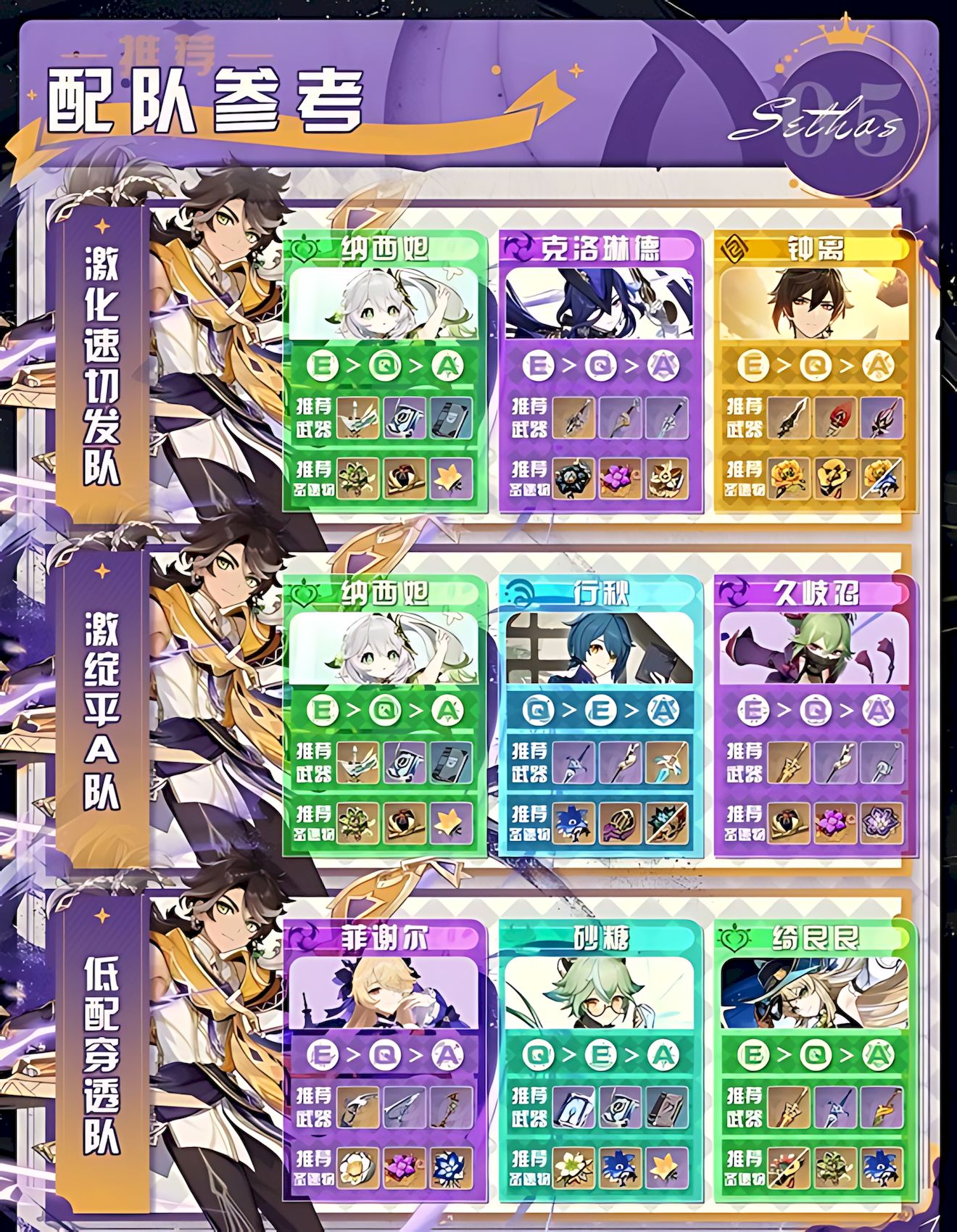 4、配隊有三類實用組合,激化速切隊搭配納西妲克洛琳德鐘離,激綻平A隊適配納西妲行秋久岐忍,低配隊可選菲謝爾砂糖綺良良。