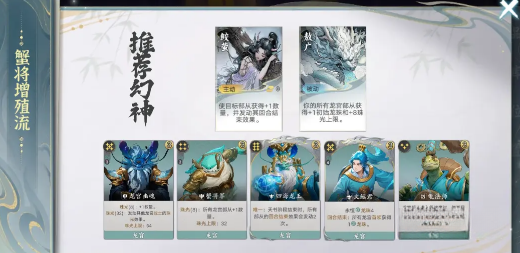 2、敖廣作為龍宮核心,提升龍珠上限強化珠光效果,搭配四海龍王觸發雙回合結束效果,實現高頻攻擊與數量碾壓。