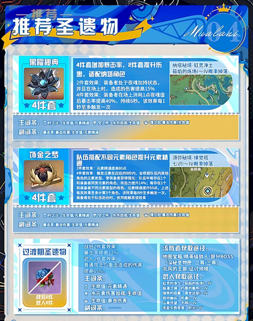 2、武器可選沖浪時光萬世流涌大典等,圣遺物推薦黑曜秘典或飾金之夢,前者提升暴擊與傷害,后者增加元素精通與反應收益。