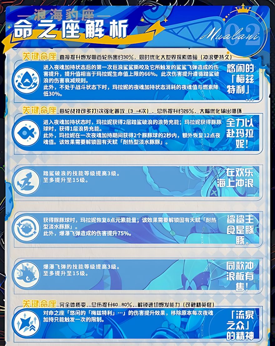 4、命座解鎖帶來顯著提升,一命強化夜魂加持首輪傷害,二命優化浪勢充能與夜魂回復,六命移除傷害限制大幅增傷。