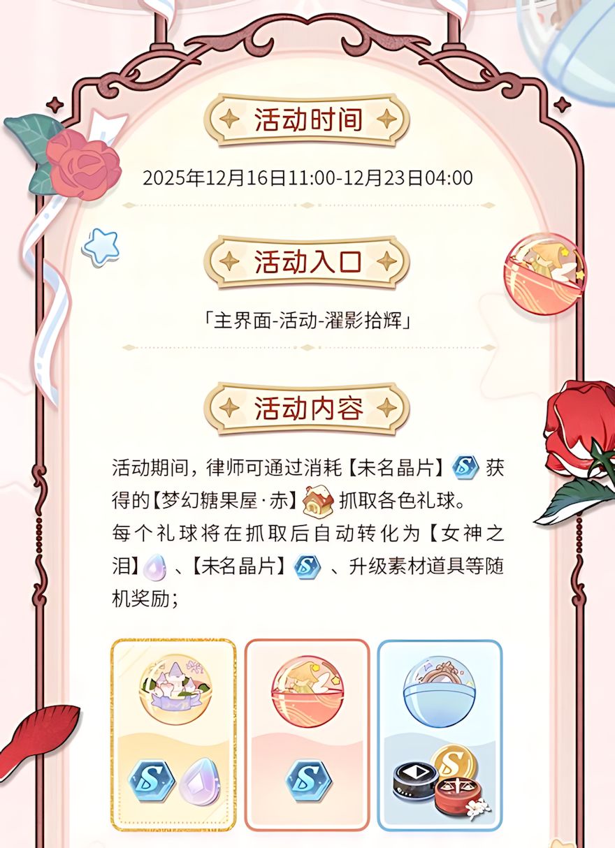 2、消耗未名晶片可兌換夢幻糖果屋赤,使用該道具抓取禮球,禮球會自動轉化為女神眼淚未名晶片升級素材等隨機獎勵。