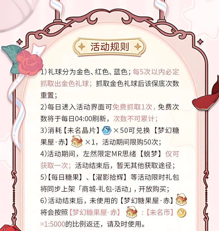 5、累計十個金色禮球可兌換左然限定MR思緒蛻夢且僅能獲取一次,活動結束后未使用道具按1比5000比例返還未名幣。