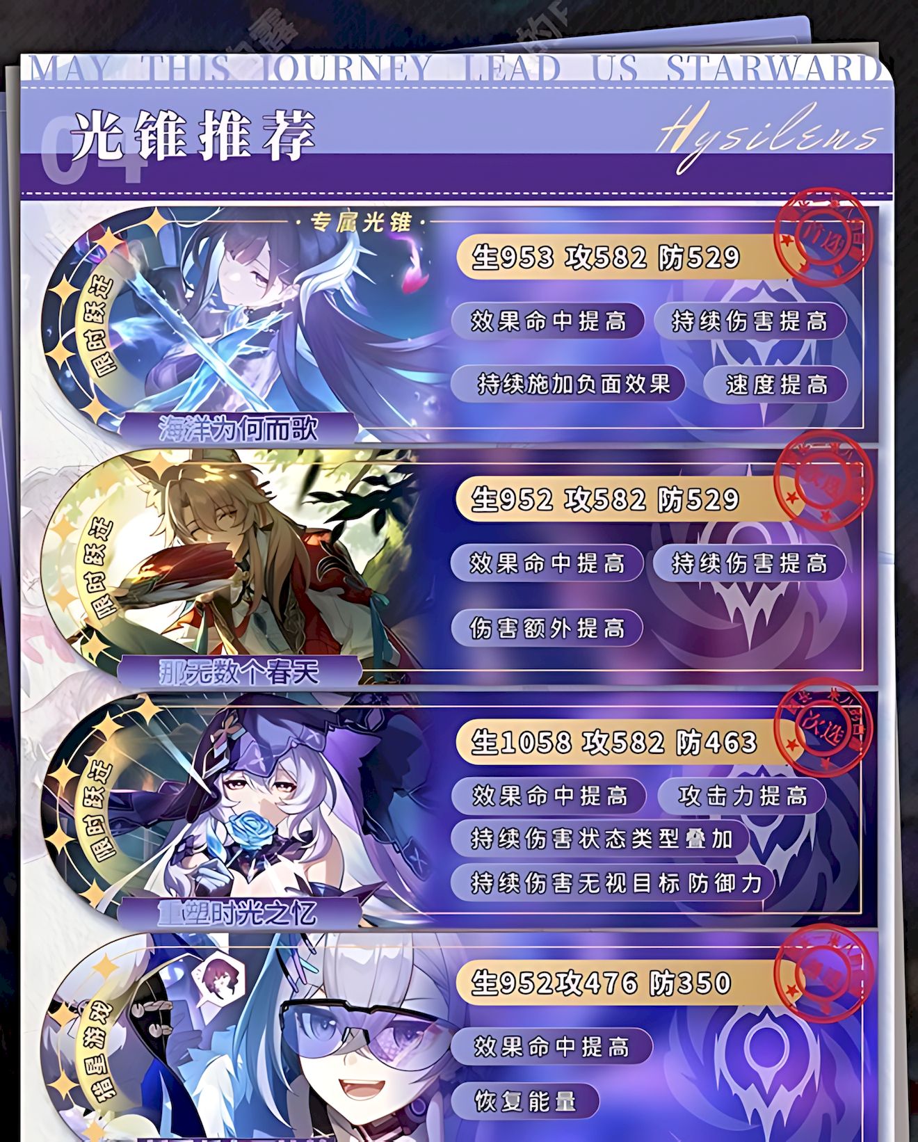 3、光錐推薦海洋為何而歌等,專屬光錐提升持續傷害與效果命中低星光錐新手任務開始前也能滿足基礎需求。