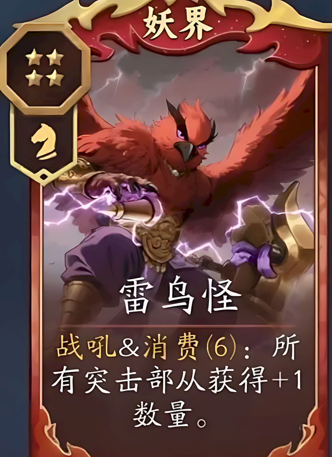 2、選擇雷鳥怪,其戰吼與消費效果能讓所有突擊部隊獲得加一數量,拿牌不順時可沿用至后期,遇大鵬需盡量多收集。