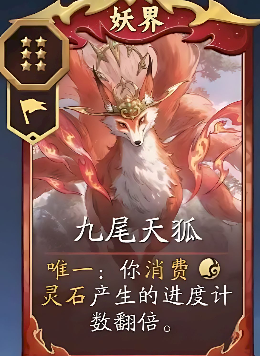 4、九尾是后期另一核心,唯一效果可使消費靈石產生的進度計數翻倍,與大鵬組合后能發揮出極佳的搭配增益效果。