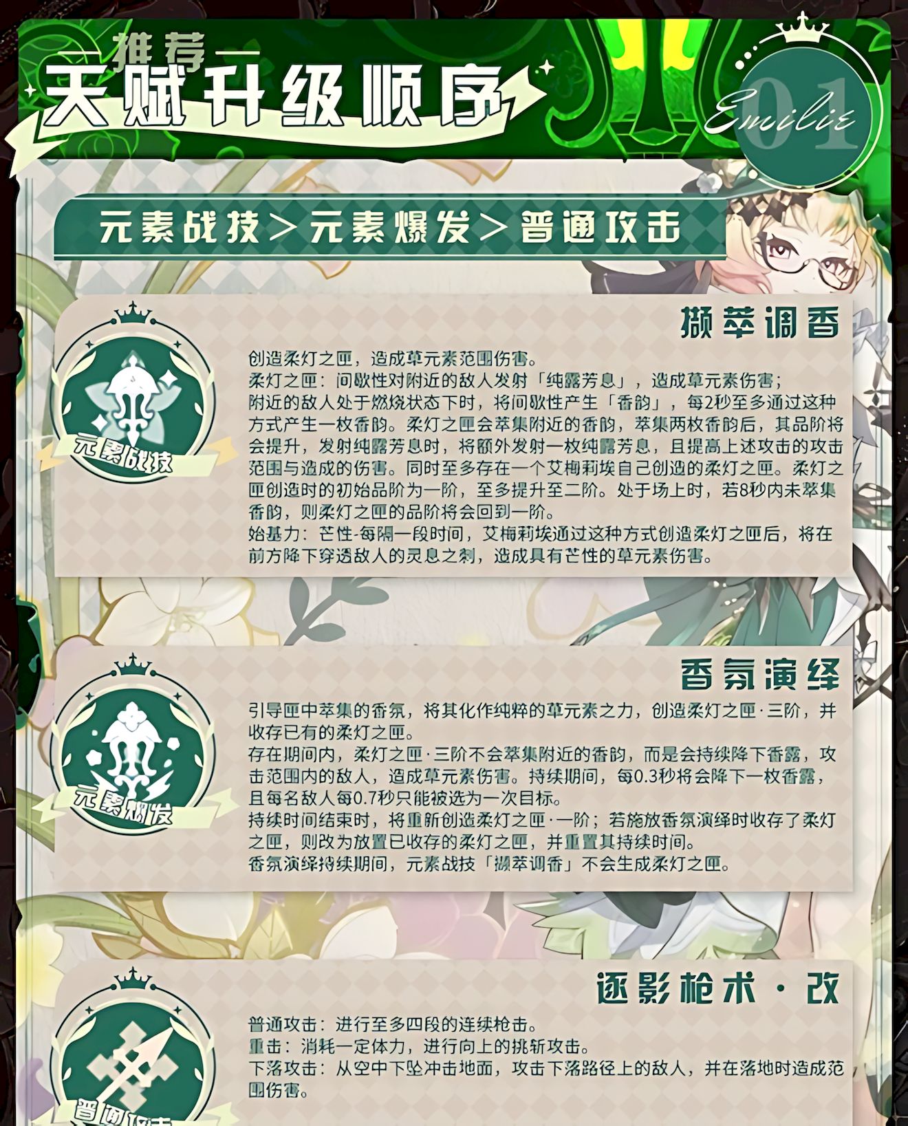 1、天賦升級明確,元素戰技優先級最高,其次是元素爆發,普通攻擊優先級最低,依此順序升級可最大化輸出效率。