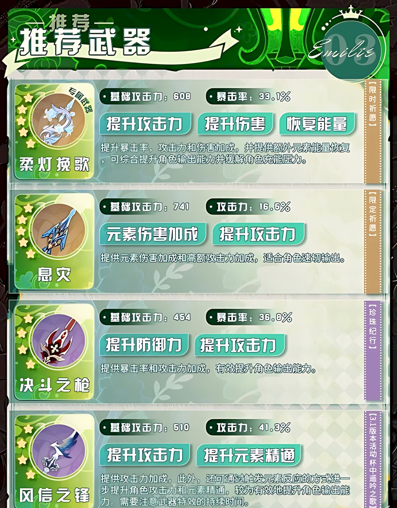 2、武器選擇多樣,專屬武器能綜合提升輸出與充能,其他推薦武器分別側重攻擊力、暴擊率或元素反應強化,適配不同需求。