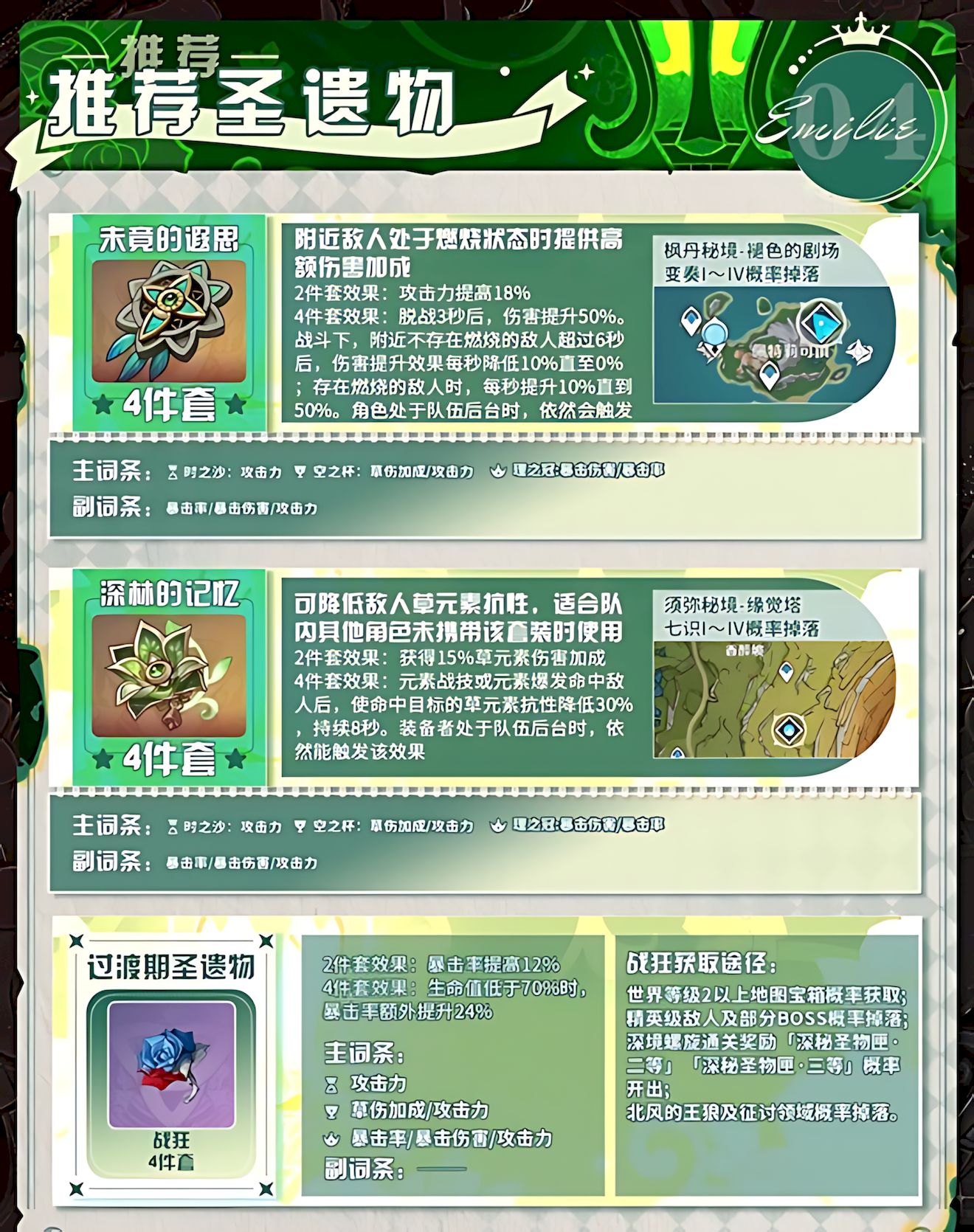 3、圣遺物有專屬適配套裝,可提供傷害加成或降低敵人草元素抗性,過渡期套裝也能滿足基礎輸出需求,主副詞條側重攻擊與暴擊屬性。