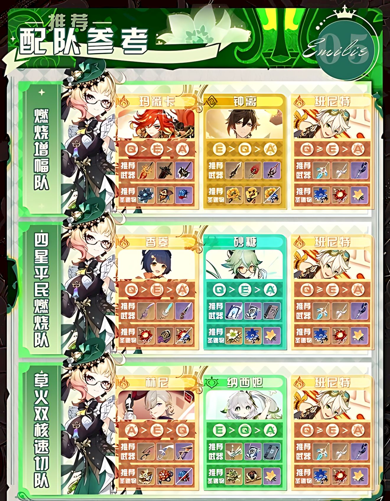 4、隊伍搭配靈活,涵蓋燃燒增幅、四星平民及草火雙核速切等體系,通過與不同角色組合觸發反應,強化整體戰斗能力。