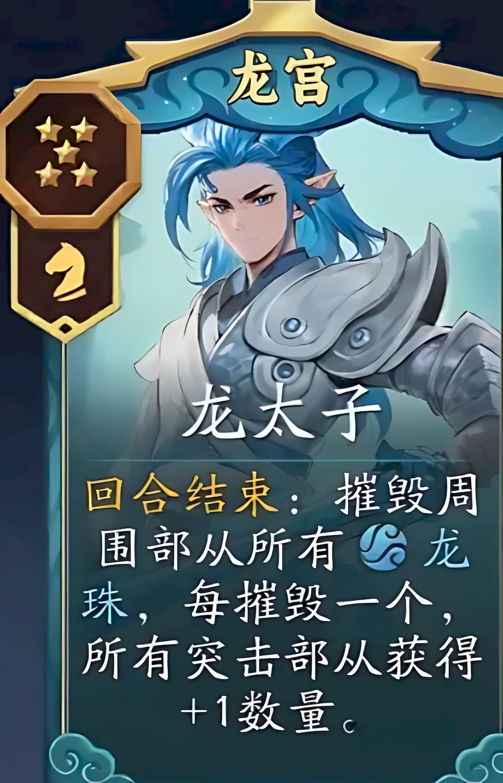2、核心卡包含覆海蛟龍龍王白虎,覆海蛟龍靠摧毀的龍珠獲額外收益,龍王激活其他卡牌,白虎讓所有騎兵數量加2且涵蓋首領部從。