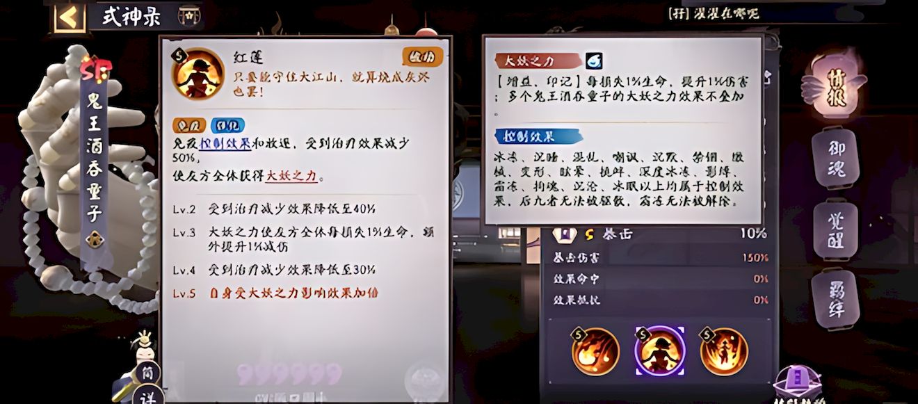 2、被動技能核心顯著,免疫各類控制與放逐效果,受治療效果隨等級降低,為全體友方賦予大妖之力,自身所受該效果額外翻倍。