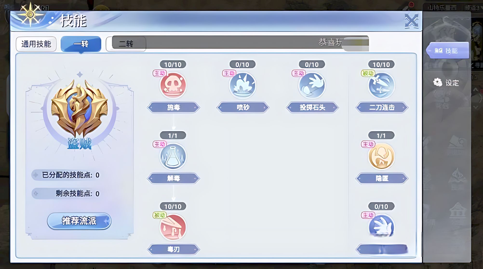 3、技能搭配優先高連爆技能如雙刀斬擊屠戮,穿刺類選精準刺殺無影手,生存向配置暗影行蹤與無敵斗志。