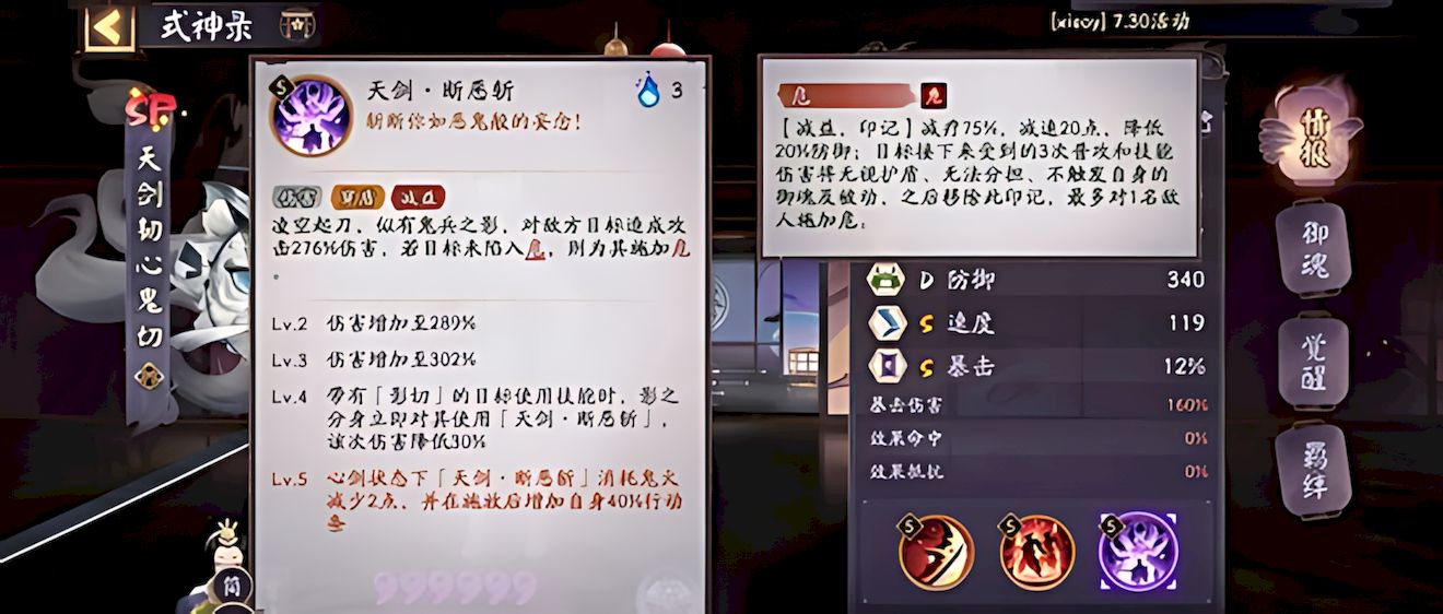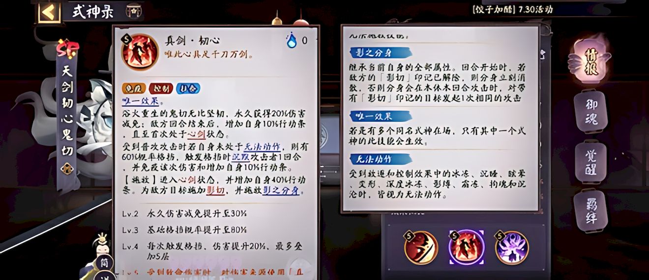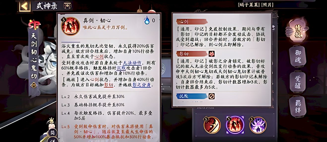3、二技能含特殊機制,可進入心劍狀態免疫控制,施加影切印記鎖定目標,自身受致命傷害時恢復50%生命值并提升屬性。