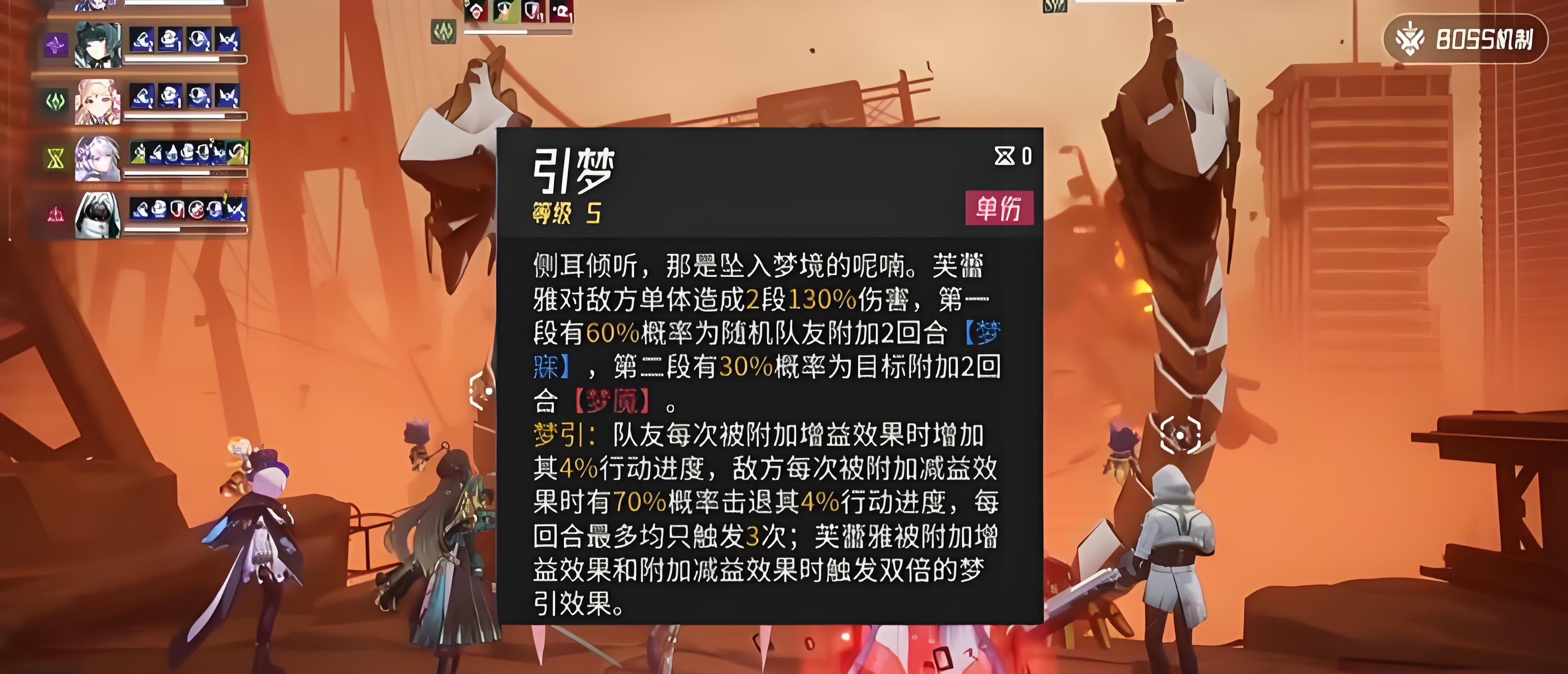 5、夢寐狀態讓隊友獲增益時加4%行動進度,敵方獲減益時70%概率退4%行動進度,夢魘為減益狀態,技能圍繞兩者調控戰斗節奏,定位輔助增益型角色。
