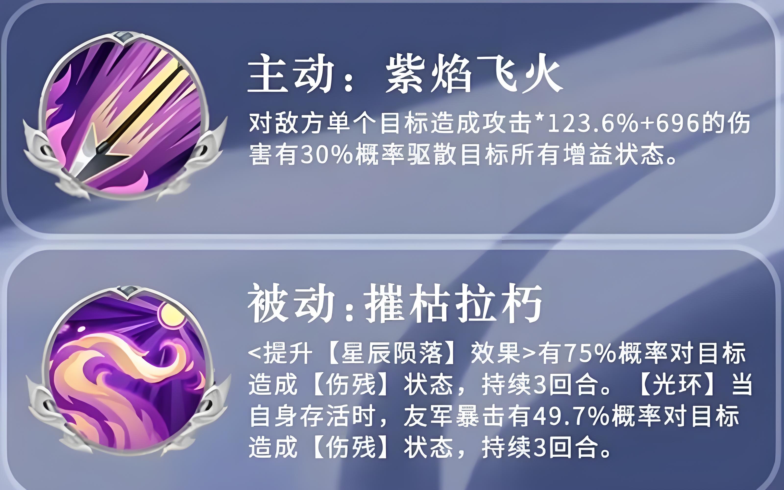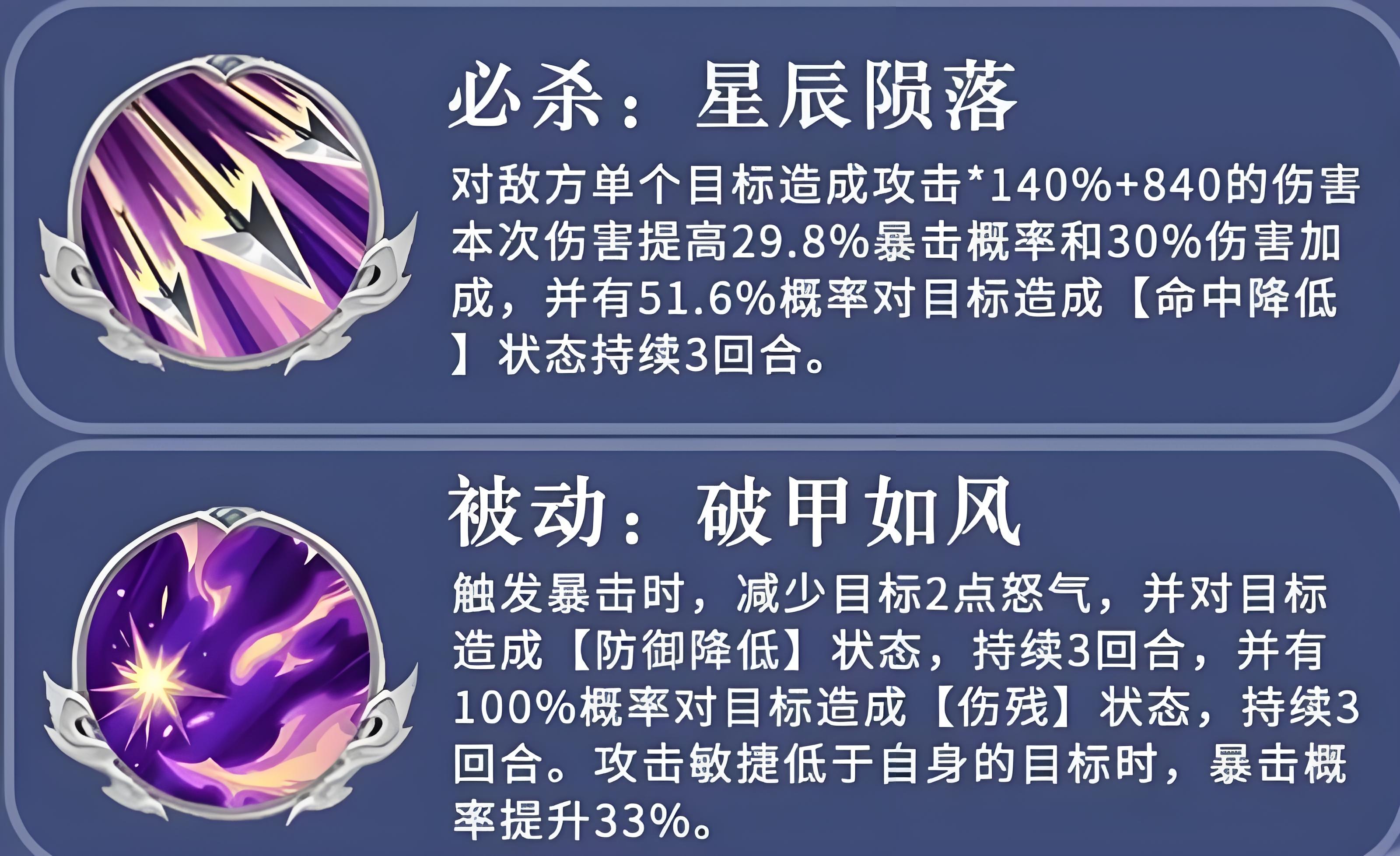 1、主動技能星辰隕落對單個敵人造高物傷,加暴擊率與傷害加成,有概率降目標命中率,開局用可建優勢精準斬脆皮。