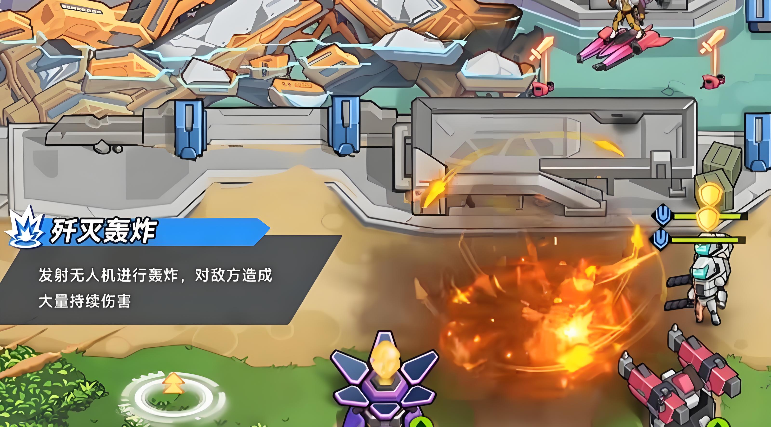 1、核心技能殲滅轟炸召喚無人機對指定區域空中打擊,對飛行敵人有天然優勢,能遏制空中攻勢減少防御塔損耗,是少見對空特化輸出。