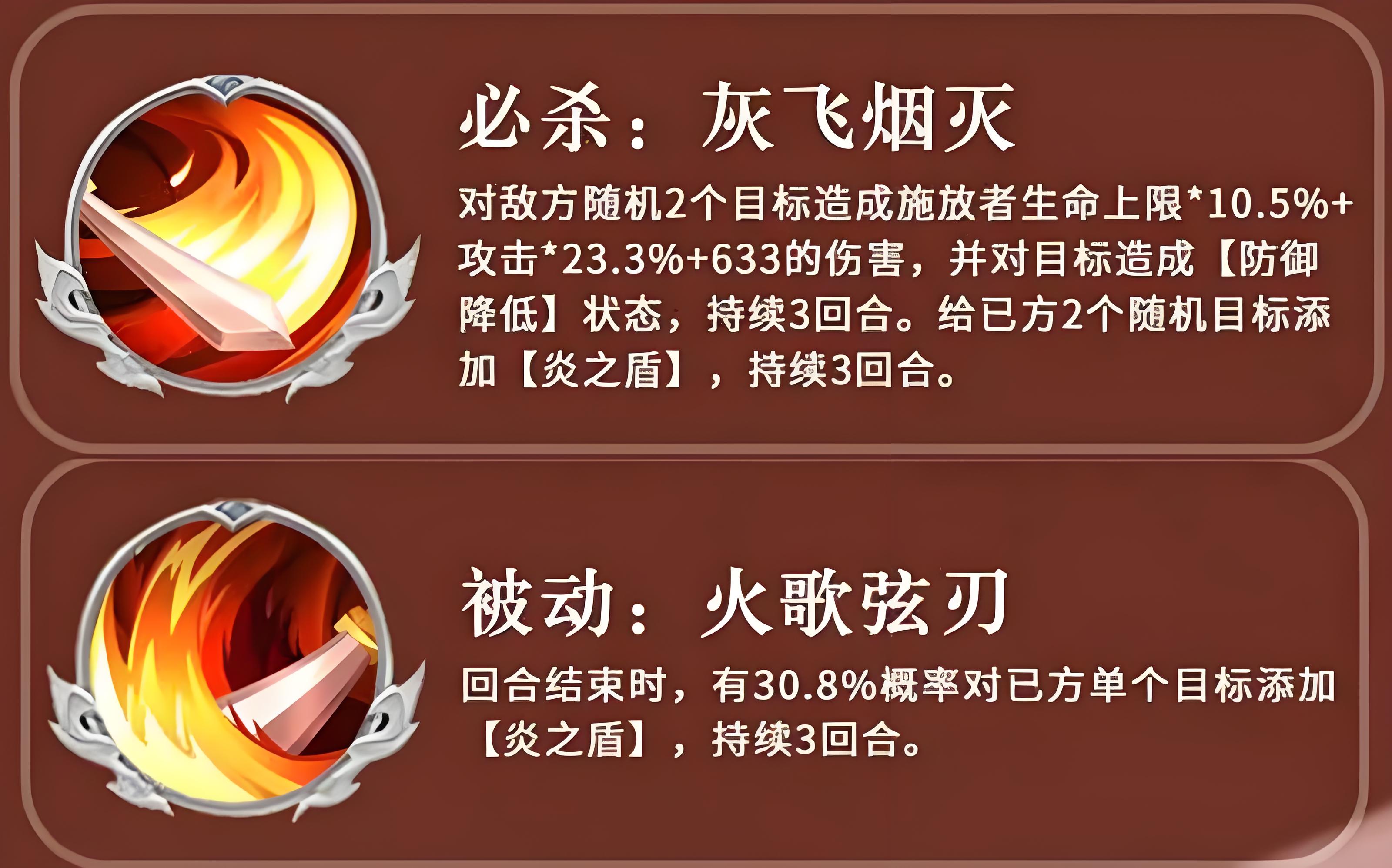 2、必殺技灰飛煙滅對敵方隨機2目標造成傷害,含生命上限10點5%、攻擊23點3%及633固定傷害,還使目標防御降低3回合,同時給己方隨機2目標加炎之盾。