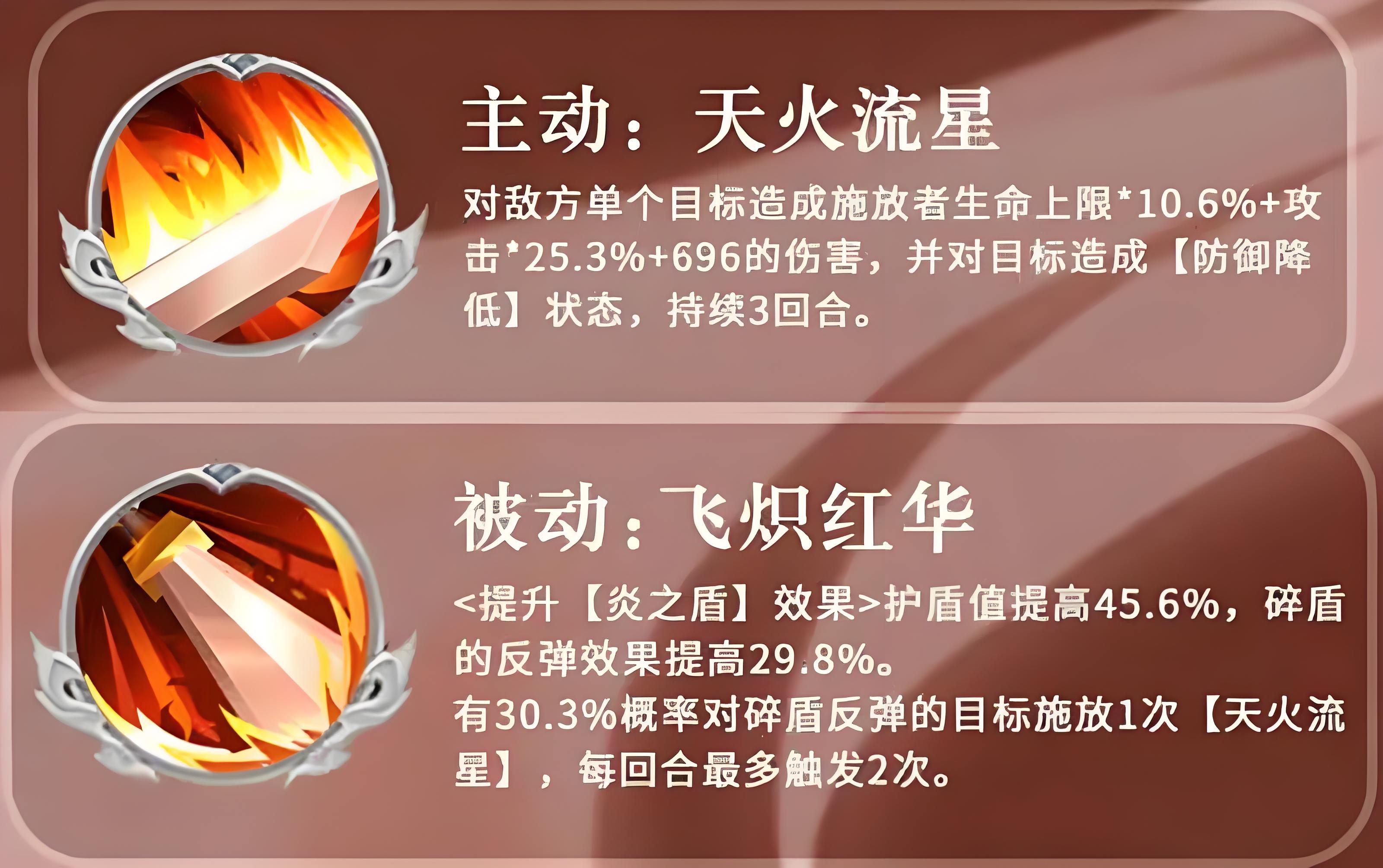 4、被動技能火歌弦刃使回合結束時30點8%概率給己方單個目標加炎之盾,被動飛熾紅華提升炎之盾效果,護盾值提高45點6%且碎盾反彈效果提高29點8%。