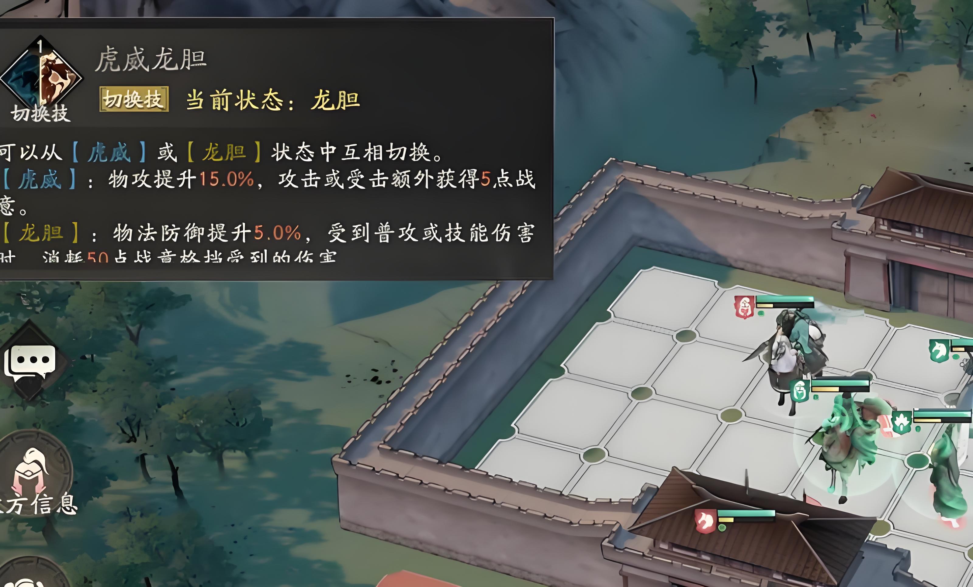 3、主動技能虎威龍膽可切換狀態,虎威態物攻升15%且攻防額外得5點戰意,龍膽態雙防升5%且耗50點戰意擋一次傷害,切換無冷卻能應變。
