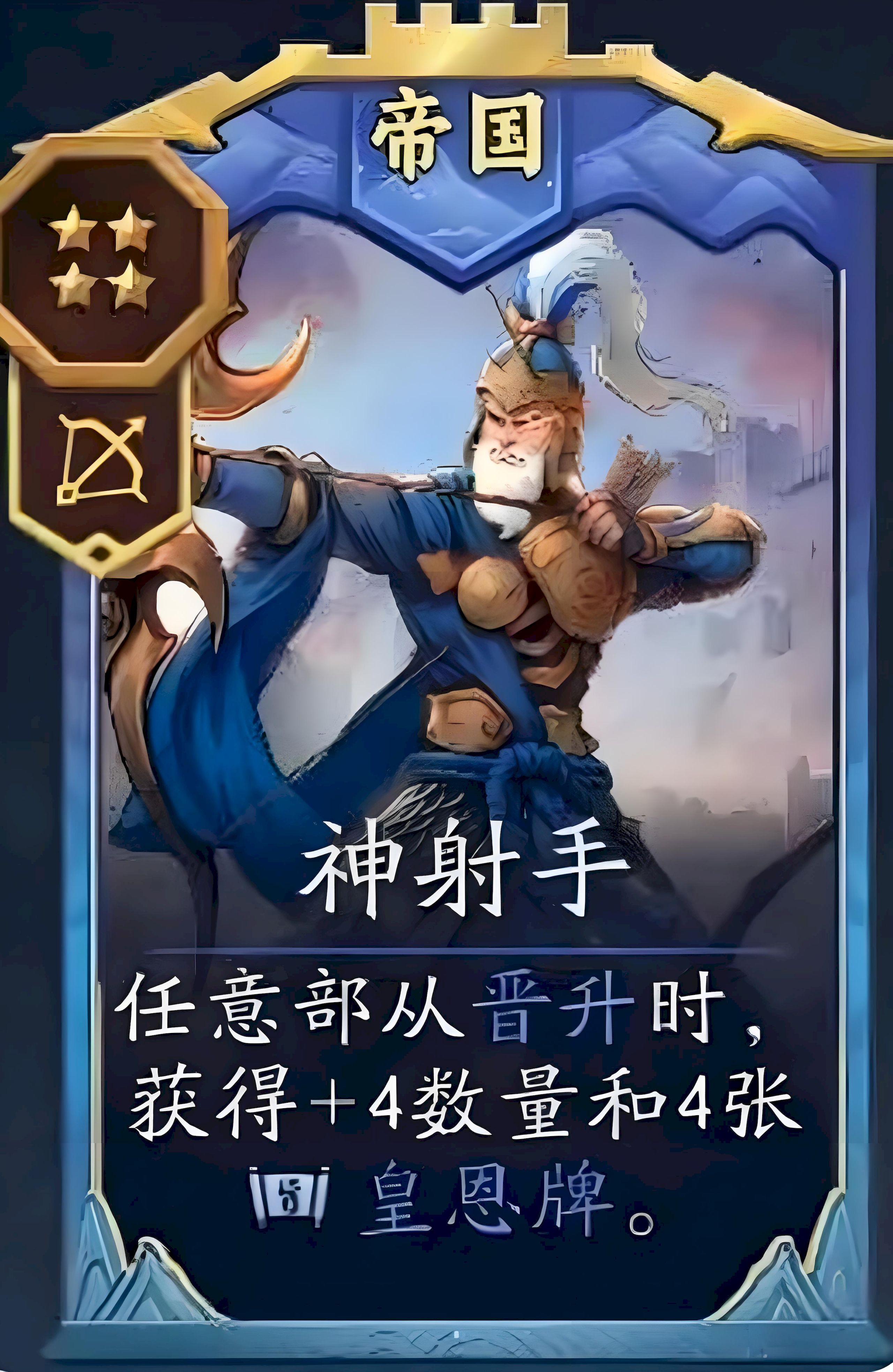 3、中期階段需全力搜神射手升三星,穩定獲取六到七張皇恩牌進入爆發期,同時積攢重騎兵升級為虎豹騎,成型后賣掉城門衛兵騰位置。