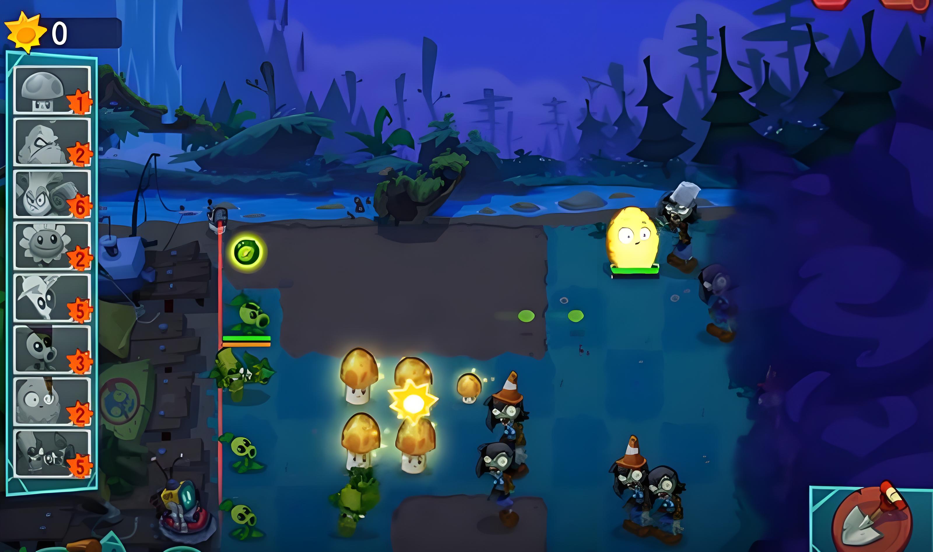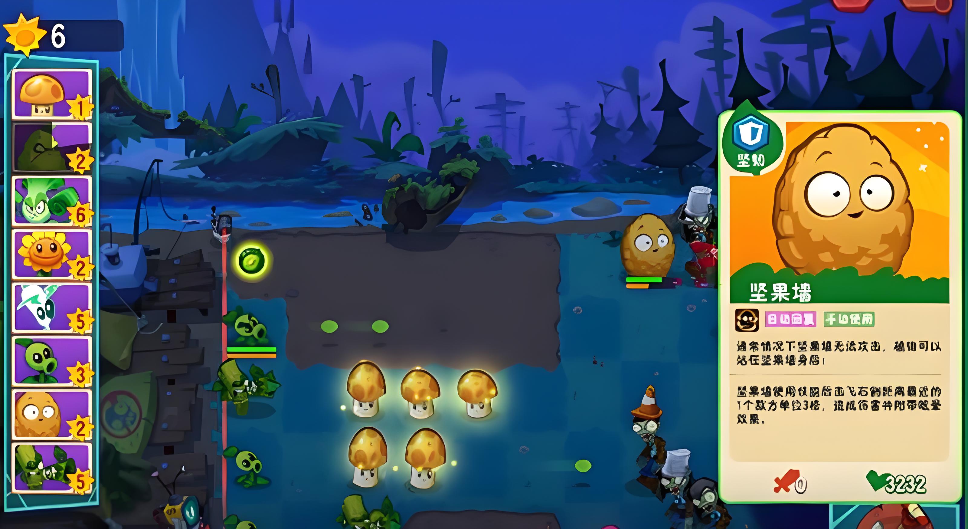 2、前排首選堅果墻,擁有4000點生命值且陽光消耗僅2點性價比高,部署在第一排可阻擋僵尸前進,25秒冷卻能反復使用。