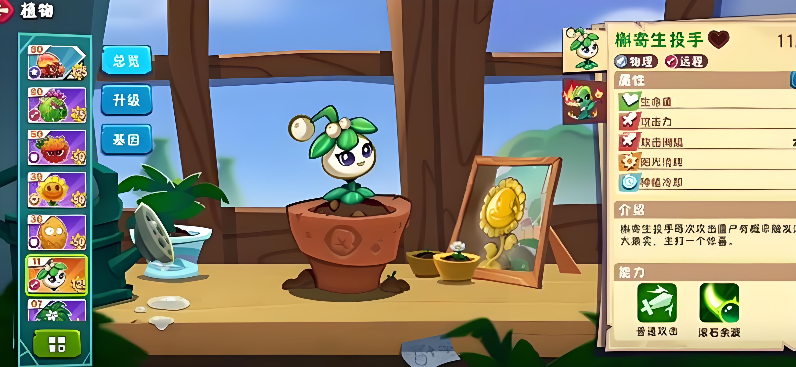4、輔助輸出選槲寄生投手,進化后發射火球附帶持續灼燒效果,技能觸發隨機范圍傷害,與爆竹火槍手輸出互補加快高血量僵尸清理速度。