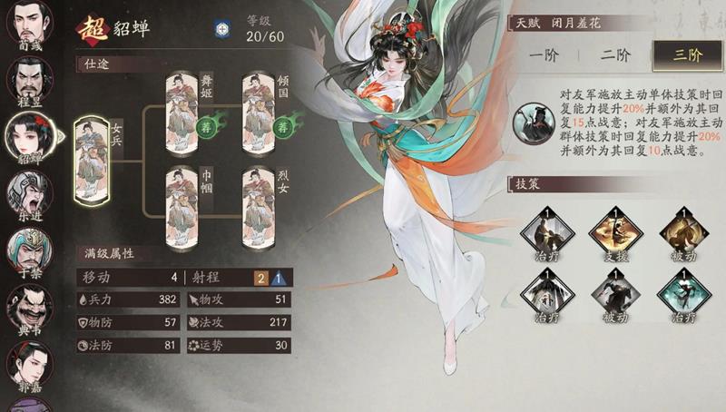 1、貂蟬是多功能輔助,主動技能傾城給全隊加30%戰法傷害,全女性隊激活巾幗被動,自身血低時為后排提攻速并回血。