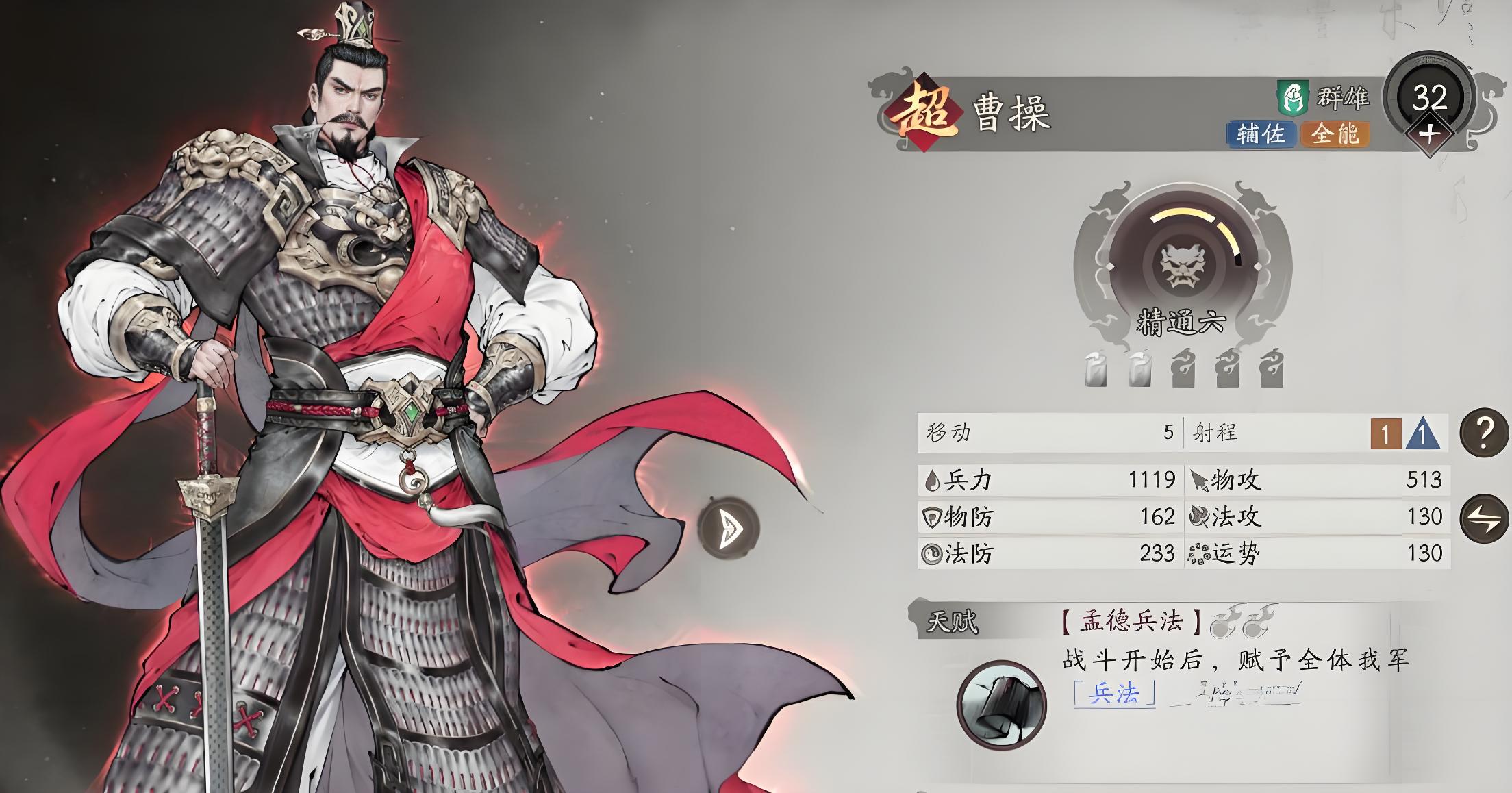 2、曹操屬團隊增益輔助,亂世奸雄技能給全隊加15%全屬性,搭副將卞氏額外提群體攻擊力,親兵系統助快速解鎖技能。