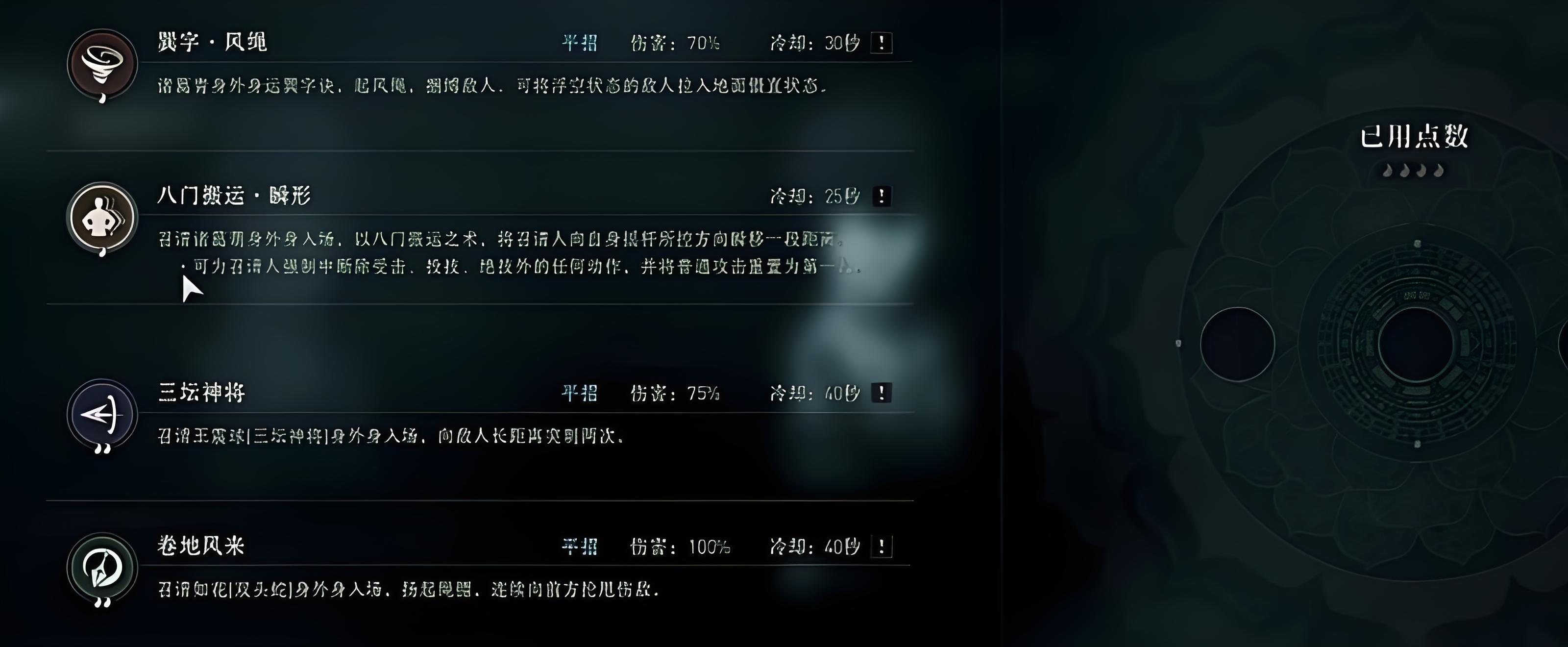 3、連招體系中完整操作鏈為兌字黑琉璃起手接風繩銜接控制再進行普攻三段最后風切收尾,一套流程僅能使用一次風繩需避免空放導致后期缺乏控制手段。
