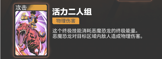 4、終結技活力二人組消耗恐龍終極能量,使其對目標區域敵人造成高額物理傷害,該技能傷害系數最高,推薦裝配加攻擊力神器增強效果。