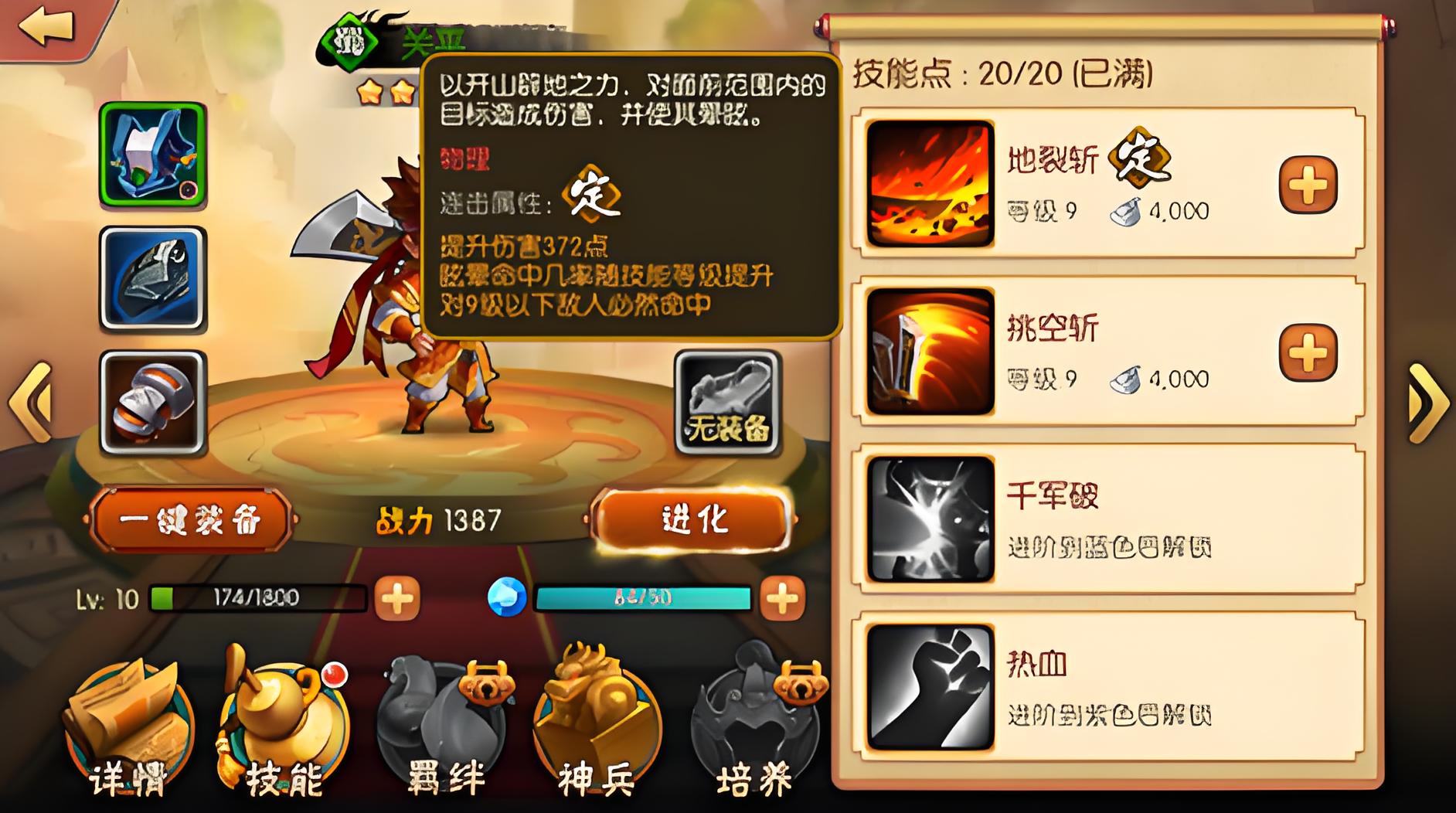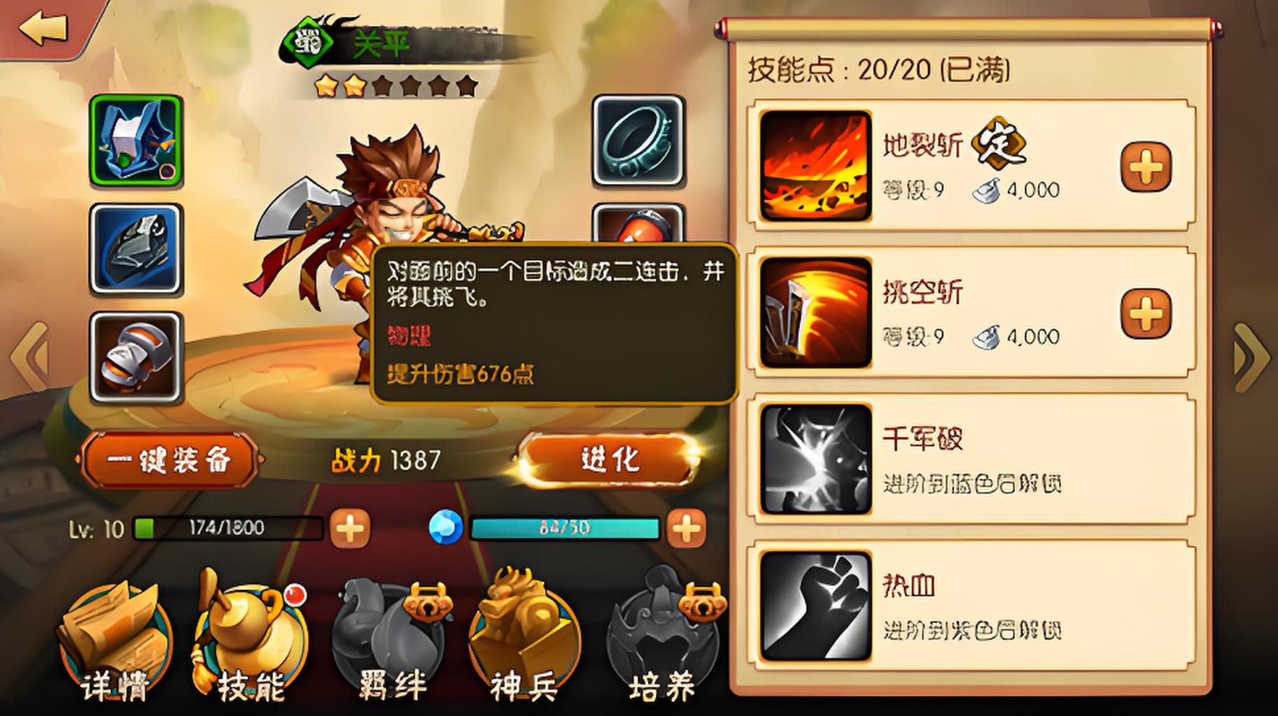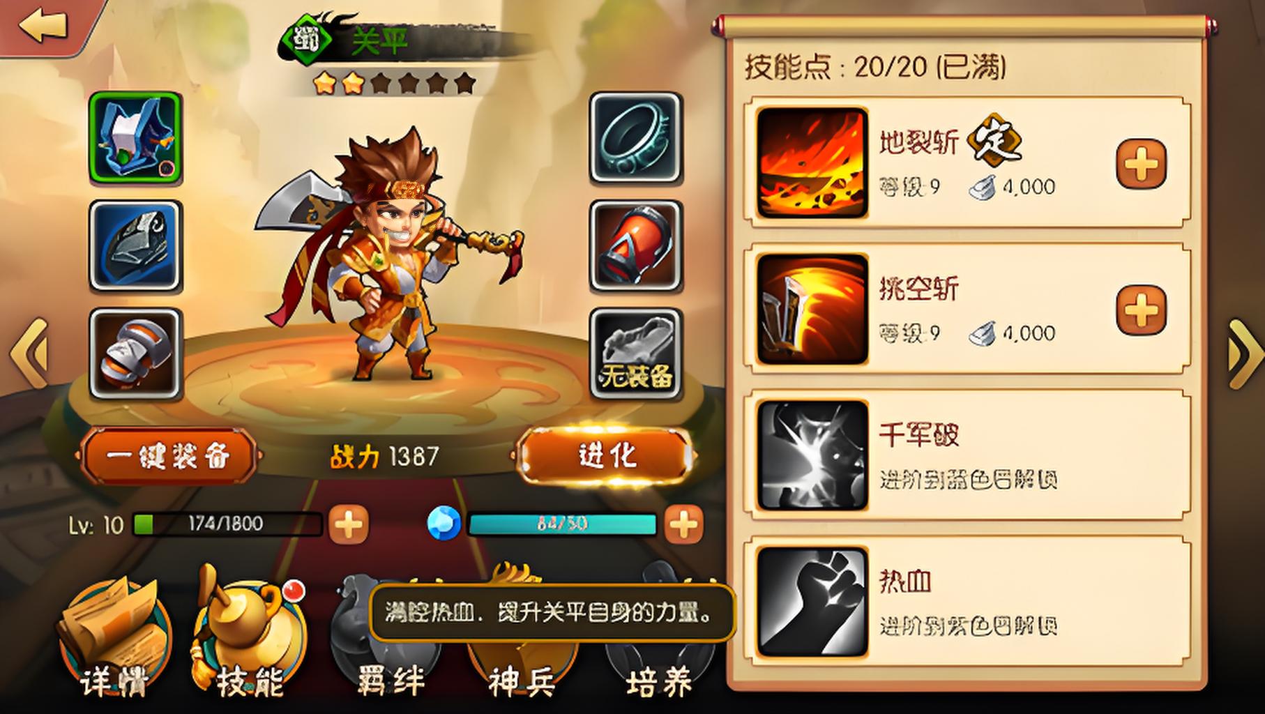 4、熱血需進階到紫色后解鎖,能大幅提升關平自身力量屬性,力量增長讓他同時增強抗傷與輸出能力,優化戰場綜合表現。