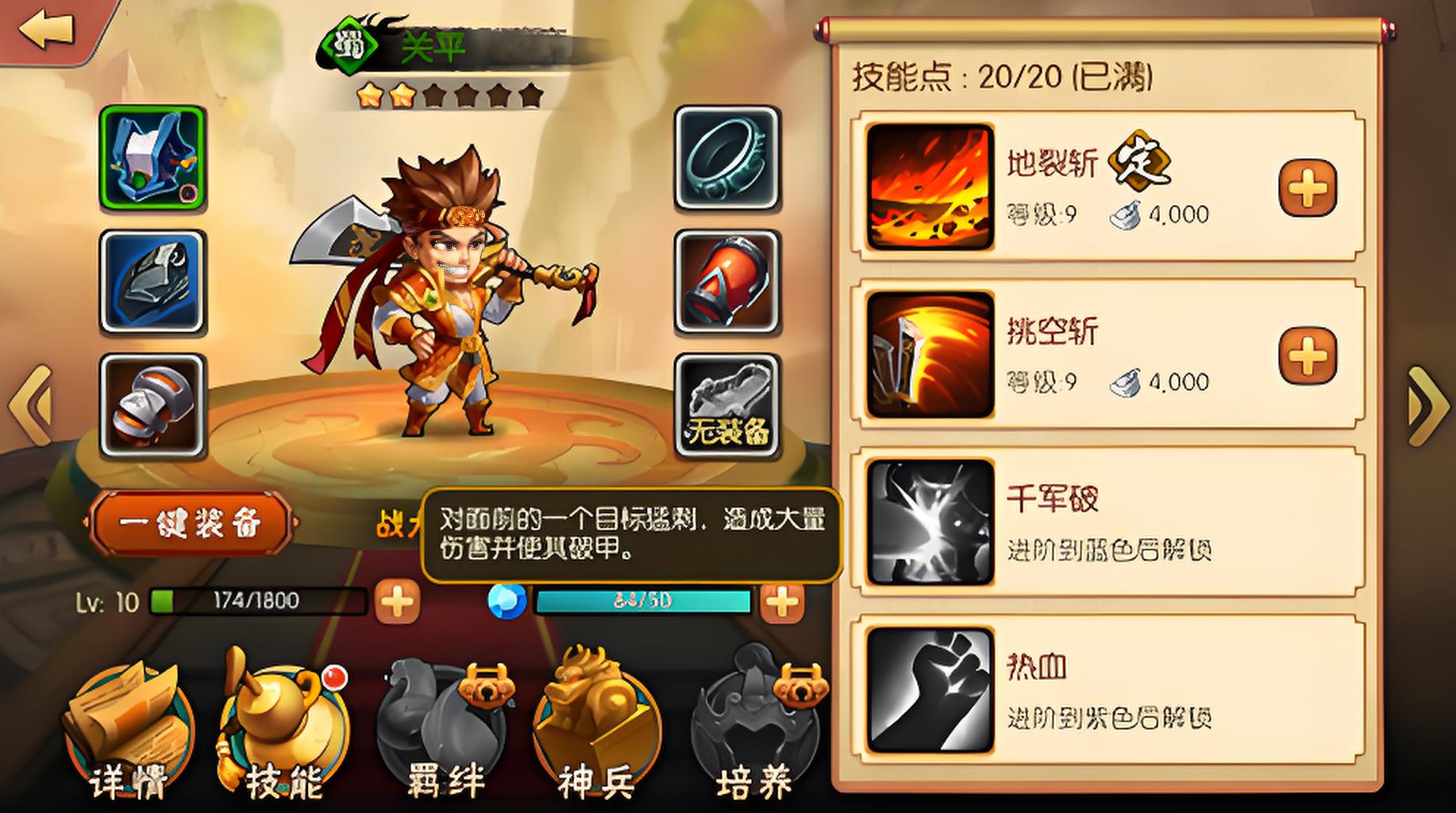 3、千軍破需進階到藍色后解鎖,對面前目標猛刺造成大量傷害并附加破甲效果,這一特性讓他成為物理隊的優質前排選擇。