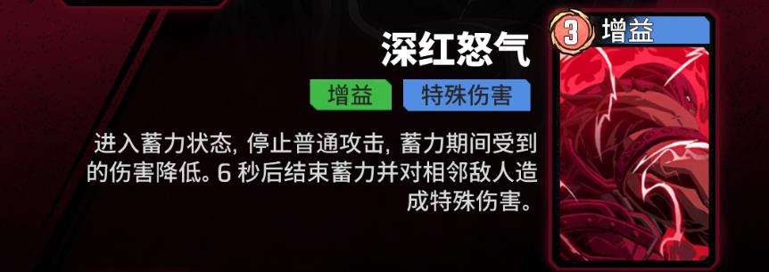 2、深紅怒氣是戰技,進入蓄力狀態停止普通攻擊,蓄力期間受傷害降低,6秒后對相鄰敵人造成特殊傷害,41級解鎖加成增加傷害且克制高攻速敵人。