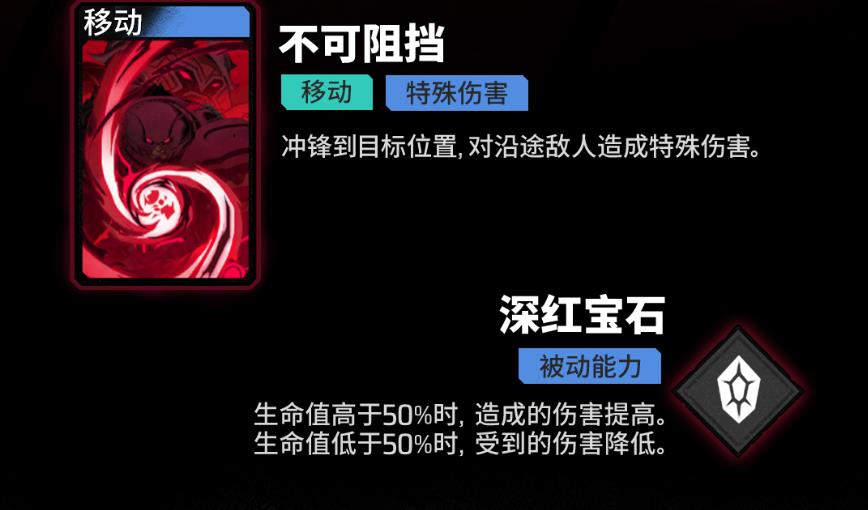 4、深紅寶石是被動能力,生命值高于50%時傷害提高,低于50%時受傷害降低,實現優勢增傷劣勢提坦度的效果適配不同戰場局勢。