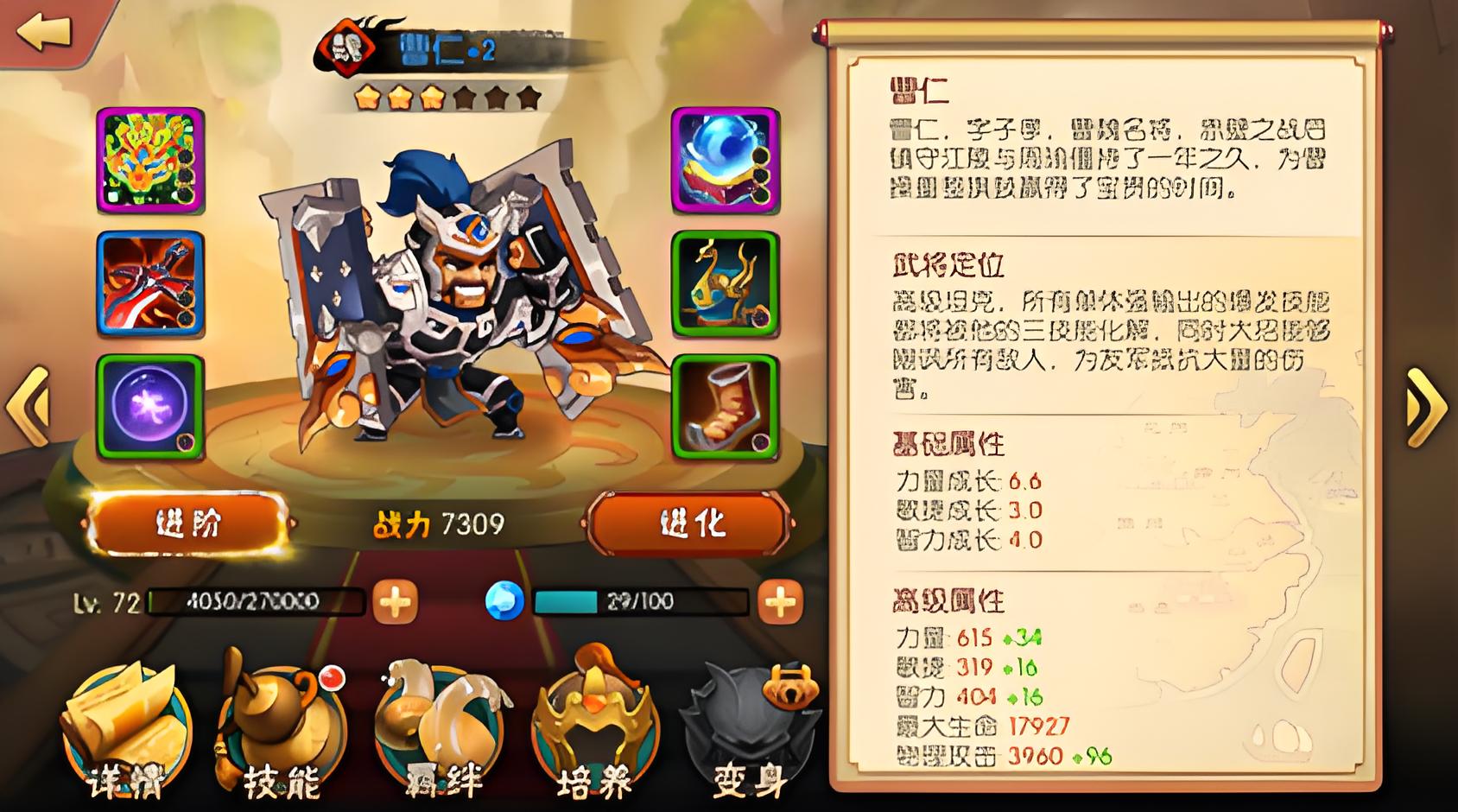 1、曹子孝定位高級坦克,能化解單體爆發技能,大招嘲諷所有敵人為友軍抗傷,721級戰力7309,力量成長6點6。